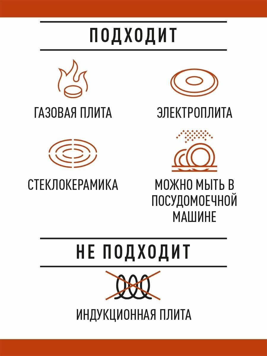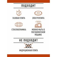 • Изделие подходит для газовых, электрических и стеклокерамических плит. Не подходит для индукционных плит. Можно мыть в посудомоечной машине.