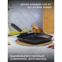 Гриль Saporelax изготовлен из высококачественного алюминия с антипригарным покрытием, которое выдерживает экстремальные температуры до 250 градусов. Гриль оборудован складной ручкой для удобного хранения и экономии места в шкафу. Ручка изготовлена из ярко зеленого силикона, который не нагревается даже при достижении максимальных температур. Рельефное покрытие с высокими желобами создает настоящий вкус гриля благодаря отведению лишней жидкости и жира. Прямо во время процесса Вы можете слить их через специальный носик сбоку сковороды. Толстое дно обеспечивает равномерное распределение жара по всей поверхности сковороды, а также позволяет полностью контролировать процесс приготовления пищи в зависимости от желаемого результата. Сковорода-гриль подходит для использования на всех типах плит, кроме индукционных, и в духовых шкафах. Можно мыть в посудомоечной машине. Не рекомендуется использовать абразивные чистящие средства. Сковорода-гриль со складной ручкой алюминиевая 26 см - это идеальный инструмент для приготовления вкусных и сочных стейков и других блюд на гриле прямо на вашей плите. Она является не только функциональной посудой для приготовления пищи, но и отличным подарком для любителей кулинарии и гриля. Сковорода-гриль предоставляет возможность наслаждаться вкусом правильно запеченного мяса и овощей в любое время, без необходимости выходить на улицу и использовать настоящий гриль. Благодаря надежному покрытию сковорода гарантирует равномерное и качественное приготовление блюд, а также легкую очистку после использования. Стенки сковороды-гриль обеспечивают оптимальную высоту для запекания мяса и овощей, сохраняя их сочность и аромат. Вы сможете создавать идеально запеченные стейки с золотистой корочкой и сохраняющимся умеренным розовым центром. Так что, если вы ищете идеальный подарок для любителя гриля или просто хотите добавить функциональность на вашу кухню, сковорода-гриль станет идеальным выбором.