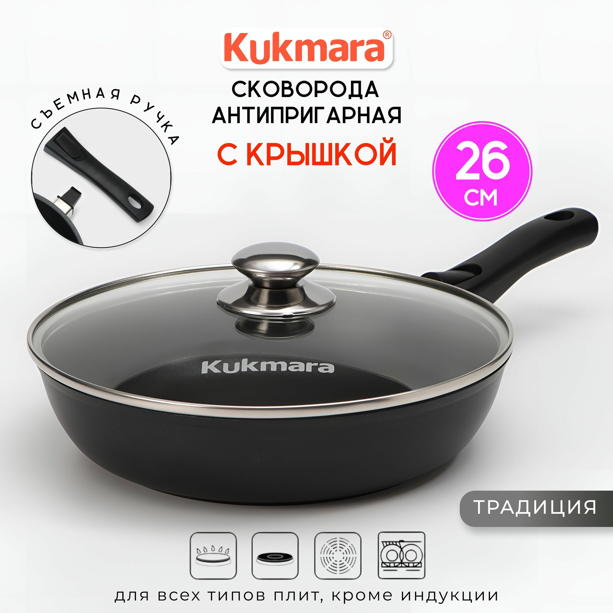 Сковорода Kukmara Традиция с крышкой, со съемной ручкой 26 см: сравнение цен, характеристики, фото, актуальное наличие и цены.
