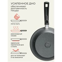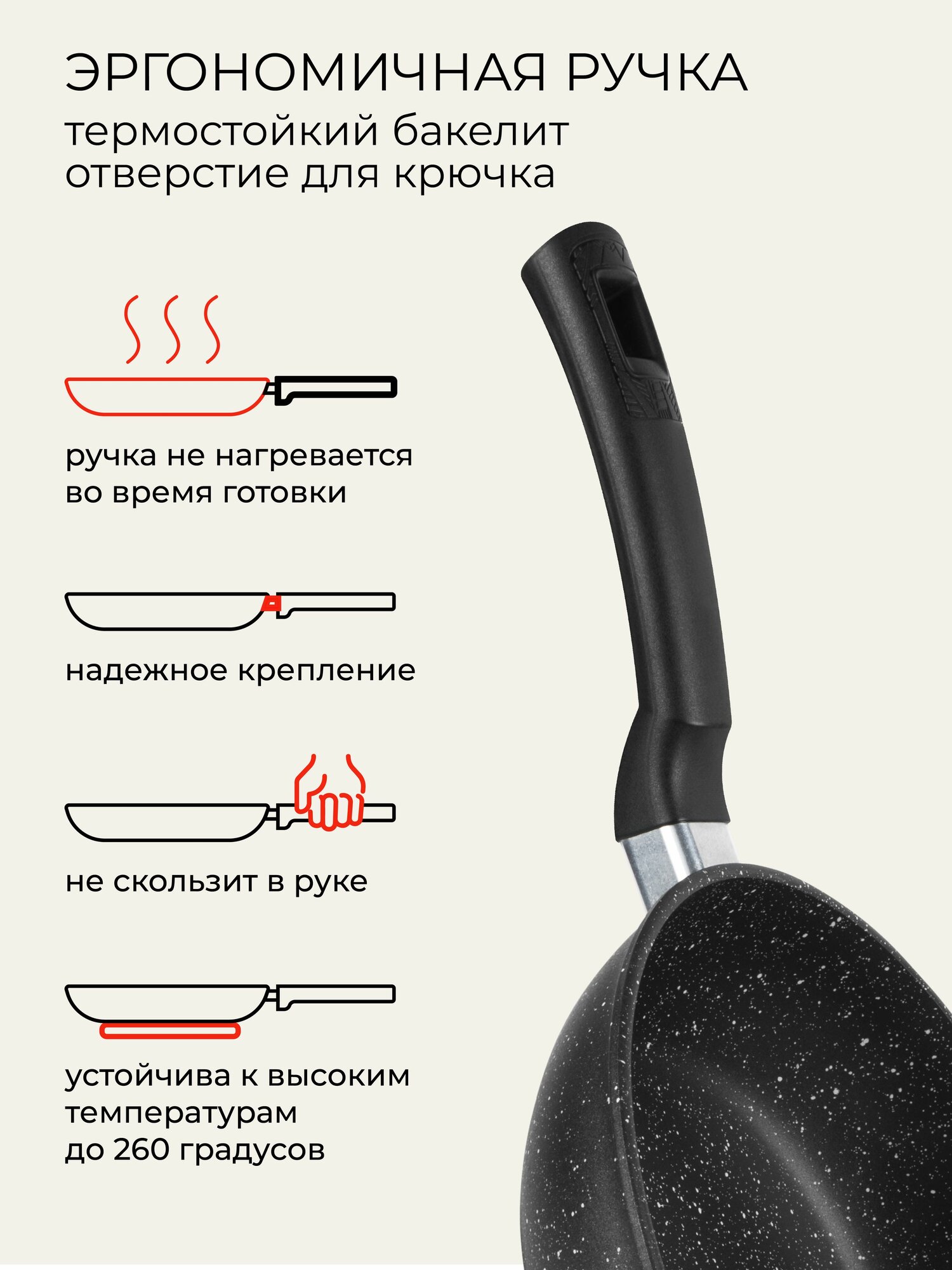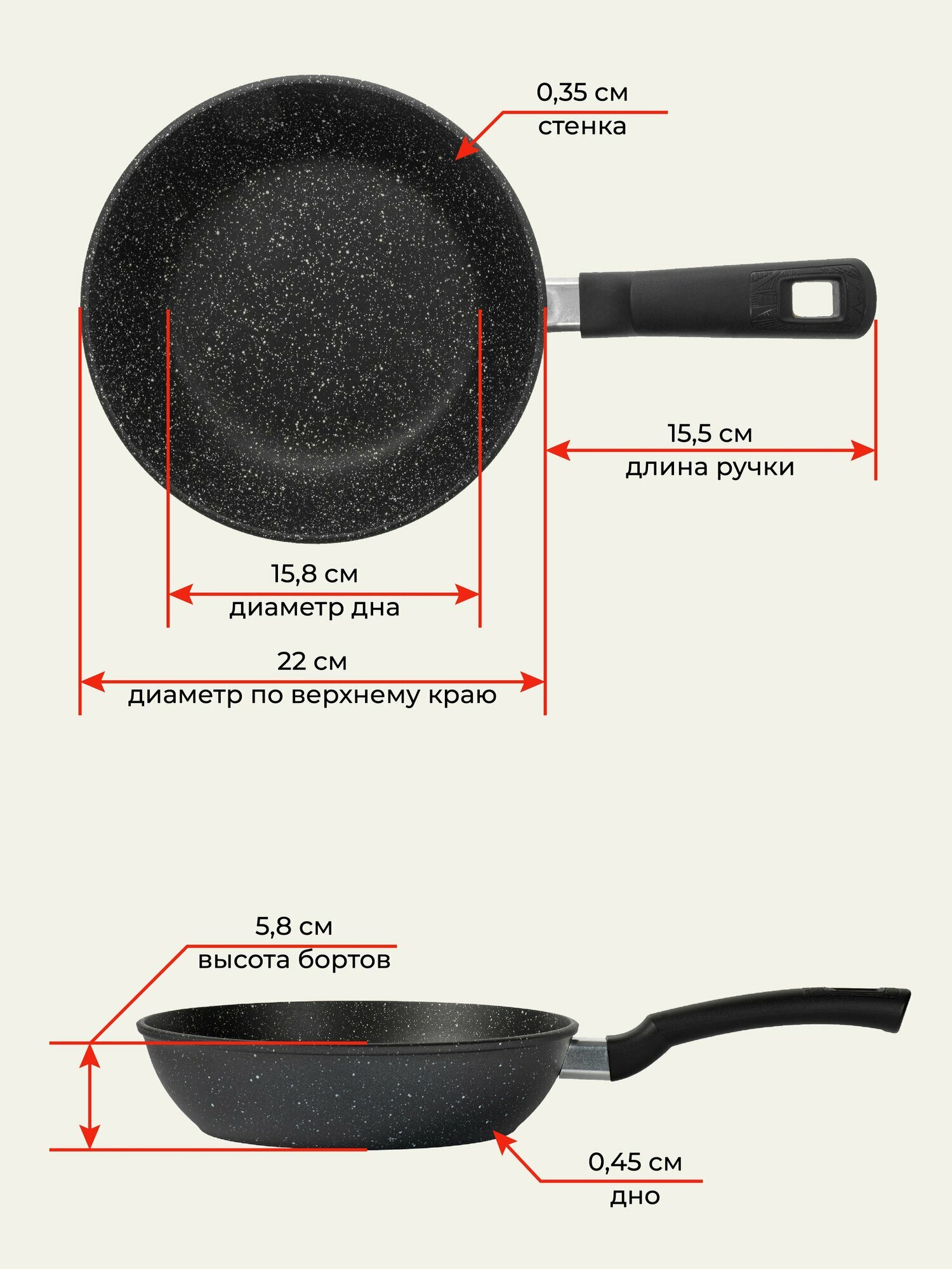 Эта сковорода представляет собой настоящую находку для тех, кто любит готовить! Она обладает всеми необходимыми характеристиками, чтобы стать незаменимым помощником на вашей кухне. Литая конструкция и антипригарное покрытие обеспечивают высокую прочность и достойное качество приготовления пищи. Сковорода глубокая 22 см с крышкой — это отличный выбор для каждого домашнего повара. Не чугунная, она легкая и функциональная, что делает ее удобной в использовании. Антипригарная поверхность поможет вам приготовить блюда без лишнего использования масла или жира, что делает еду более полезной. Сковорода с антипригарным покрытием также оснащена удобной ручкой, которая не нагревается во время приготовления и обеспечивает комфортную эксплуатацию. Благодаря своей компактности и размеру 22 см, она идеально подходит для приготовления яичницы, а также может использоваться для других блюд. Комплектация: корпус из пищевого алюминиевого сплава с антипригарным покрытием, ручка из термостойкого пластика несьемная. Длина ручки - 15.5 см. Сковорода изготовлена по ГОСТ Р 56674-2018. В производстве используются европейские технологии и качественная европейская фурнитура. Перед первым использованием вымойте сквороду в теплой воде, высушите и затем слегка смажьте всю поверхность растительным маслом. Длительное накаличание сковороды может повредить антипригарное покрытие, поэтому не допускайте нагрева изделия без продуктов или воды. Не следует мыть посуду с антипригарным покрытием металлическими щетками и абразивными чистящими средствами. Не рекомендуется использовать агрессивные моющие средства. Не рекомендуется подвергать нагретую сковороду резким перепадам температур. Остудите посуду перед тем, как поместить ее в воду. Острые столовые приборы могут повредить антипригарное покрытие. Не используйте сковороду с несьемной ручкой в духовом шкафу.