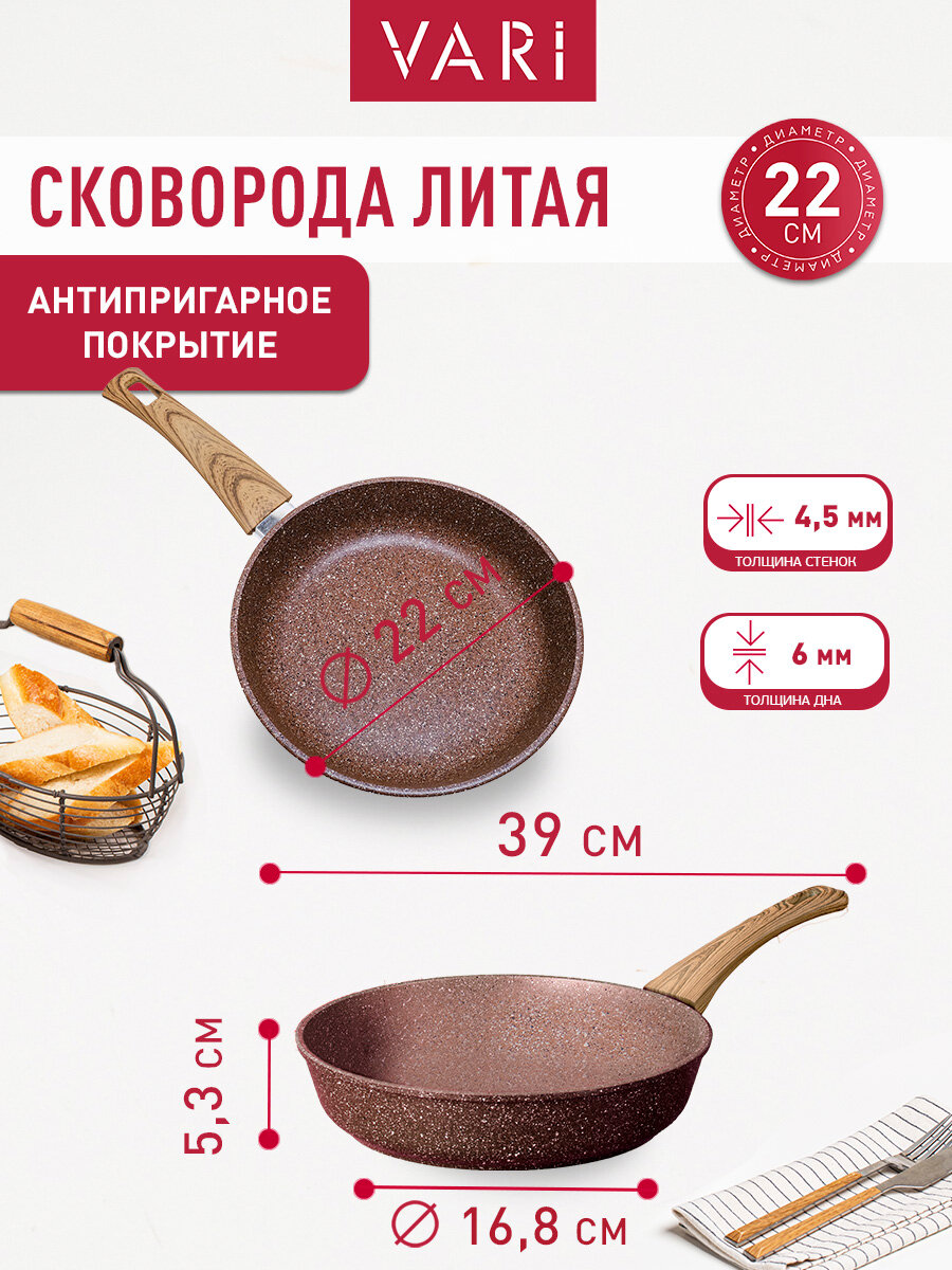 Литая сковорода диаметром 22см из современной экологичной коллекции посуды «Сила природы BROWN» воплотит атмосферу природной натуральности и свежести на Вашей кухне. Качественное антипригарное покрытие Quantanium нанесено в три слоя и не допускает пригорания продуктов, позволяя готовить без масла. Покрытие не содержит PFOA (перфтороктановую кислоту), поэтому безопасно для человека. Изделие изготовлено из толстостенного алюминия, который быстро раскаляется и долго держит тепло. Массивное дно равномерно распределяет жар по всей поверхности, обеспечивая равномерную прожарку. С наружной стороны сковороды нанесено жаростойкое силиконовое покрытие, предохраняющее стеклокерамическую плиту от повреждений и загрязнений. Цветовое решение в природных коричневых оттенках, толстое дно и стенки, жаропрочные ручки и безопасное антипригарное покрытие на водной основе - эта посуда создана, чтобы ощущать близость с природной и готовить полезные блюда. Толщина стенки 4,5 мм; дна 6 мм. Подходит для газовых, электрических и стеклокерамических плит. Не подходит для индукционных плит. После использования можно мыть в посудомоечной машине.