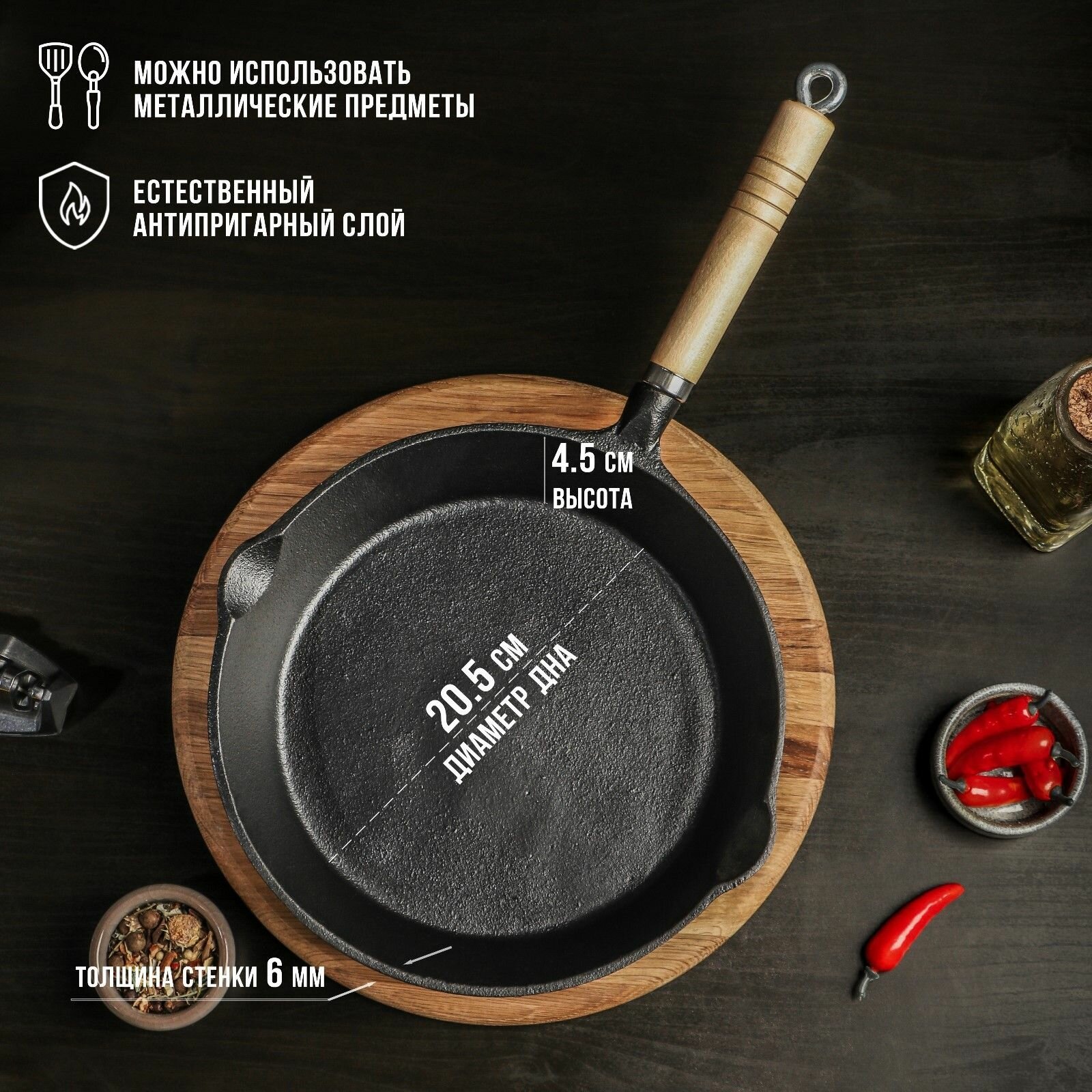 Сковорода Magma Эко , 25 4.5 см, чугун, с 2 сливами, съёмная деревянная ручка, индукция, чёрная: сравнение цен, характеристики, фото, актуальное наличие и цены.