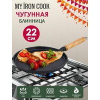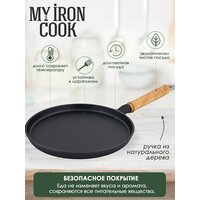 Блинная сковорода, изготовленная из натурального экологически безопасного чугуна, оснащена деревянной ручкой. Чугун является одним из лучших материалов для производства посуды. Его можно нагревать до высоких температур. Он очень практичный, не выделяет токсичных веществ, обладает высокой теплоемкостью и способен служить долгие годы.