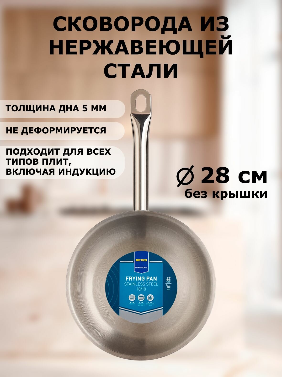 Сковорода профессиональная из нержавеющей стали STEEL, 28 см