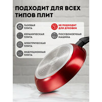 Красный цвет кухонной посуды станет ярким цветовым акцентом на вашем кухонном пространстве. Многофункциональная сковорода с крышкой прекрасно подойдет для кулинарных экспериментов, в ней можно потушить овощи, пожарить мясо, картофель, приготовить рыбу с маринадом или сложный гарнир, сделать изысканный соус.