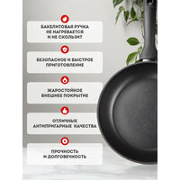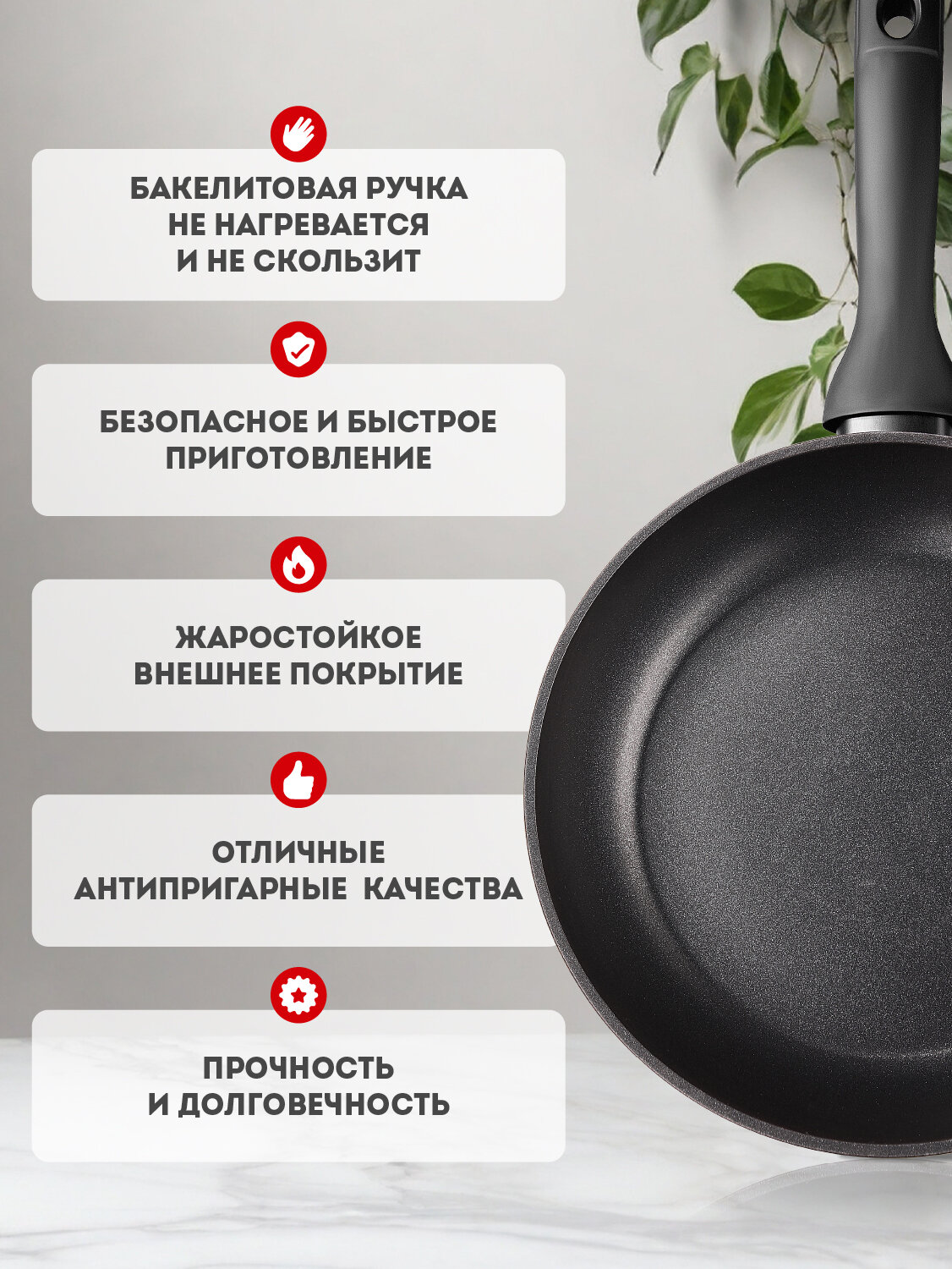 Алюминиевая сковорода имеет утолщенное армированное дно и снабжена многослойным антипригарным покрытием Xylan, рассчитанным на интенсивное использование в течение длительного срока. Посуда абсолютно безопасна для здоровья и не содержит вредных веществ. Антипригарная сковорода оснащена удобной несъемной бакелитовой ручкой с покрытием Soft touch, которое не нагревается во время приготовления и не скользит в руках.