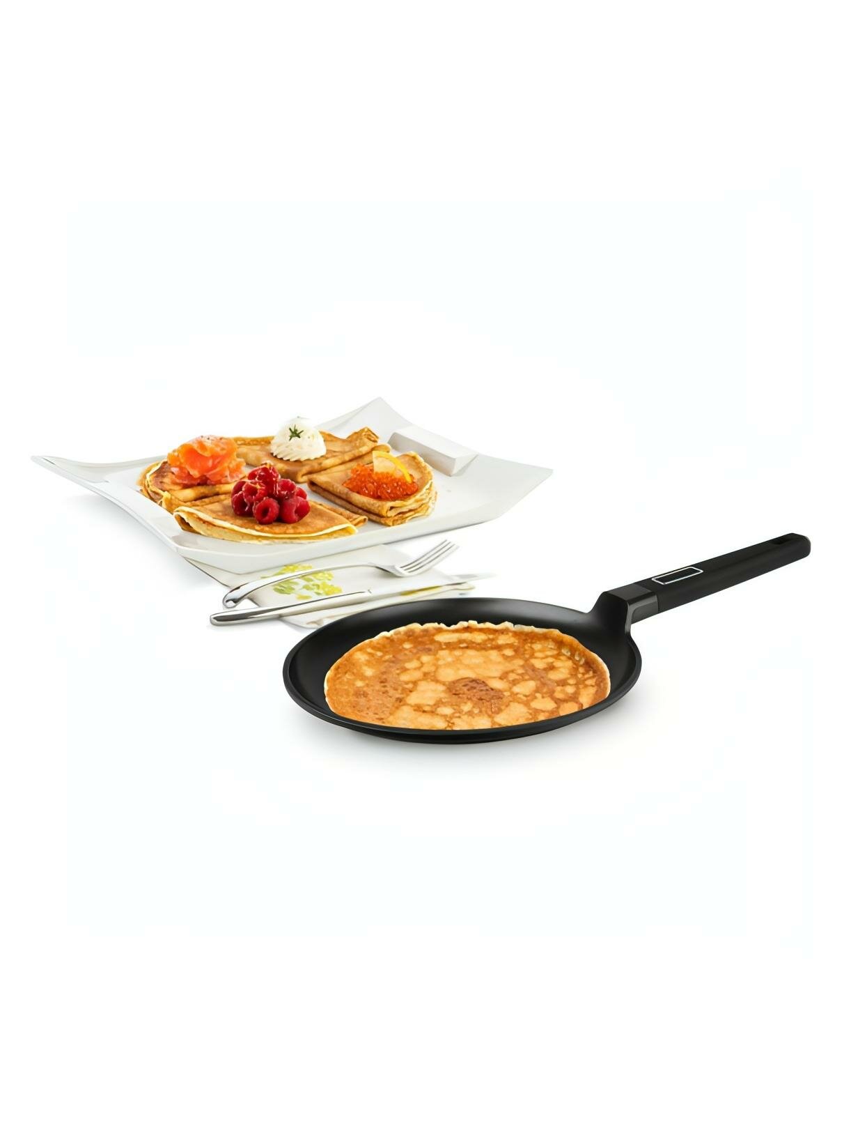 Блины способны выручить в самых разных гастрономических ситуациях. Пышные панкейки подойдут для завтрака, тонкие блинчики с несладкой начинкой, свернутые рулетиками, хороши в качестве закуски, а большие - могут стать основой оригинальных тортов. Поэтому значение правильной посуды для приготовления этого блюда трудно переоценить. Проверьте в деле блинную сковороду коллекции Pancake frypan и убедитесь, что процесс может быть не только простым, но еще и очень приятным. Внутреннее покрытие Xylan Plus - двухслойное, долговечное антипригарное покрытие для интенсивного использования Особый комфорт обеспечивают также ненагревающаяся бакелитовая ручка, благодаря которой вам не придется использовать прихватку. Толщина стенок: 2,5 ммТолщина дна: 2,5 ммИспользование: Не подходит для духовки. Подходит для всех видов плит, включая индукционные. Подходит для посудомоечной машины.