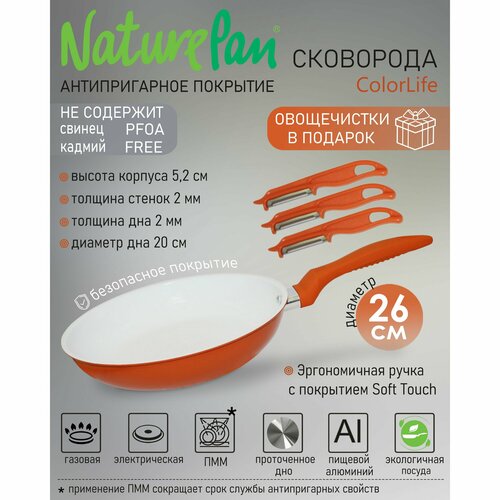 Купить Сковорода с антипригарным керамическим покрытием, d26см, NaturePan ColorLife, овощечистки в подарок с доставкой по всей России. Сковорода с антипригарным керамическим покрытием, d26см, NaturePan ColorLife, овощечистки в подарок: сравнение цен, характеристики, фото, актуальное наличие и цены.