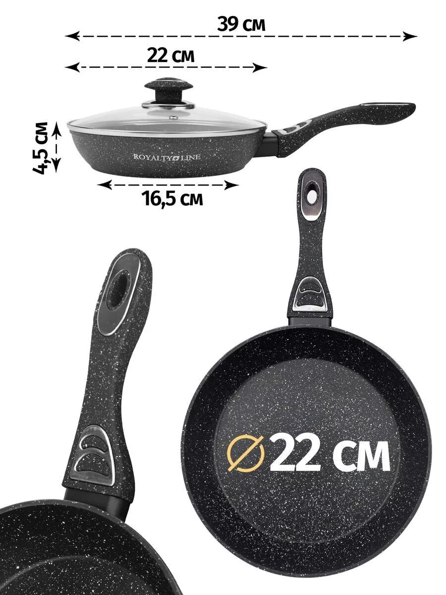 Хотите приготовить вкусные блюда без лишних хлопот? Тогда наша сковорода с крышкой 22 см - идеальное решение для вас! Это набор, который обязательно понравится настоящим гурманам и тем, кто любит готовить вкусные и полезные блюда. Наша сковорода изготовлена из литого алюминия, что делает ее прочной и долговечной. Мраморное антипригарное покрытие позволяет готовить пищу без использования большого количества масла, что делает ваши блюда более полезными и диетическими. Сковородка подходит для всех видов плит, в том числе индукция. Вы можете использовать ее на всех типах плит, включая индукционные. Стеклянная крышка, входящая в комплект, помогает сохранить аромат и вкус блюд, а также ускоряет процесс приготовления. Наша сковорода идеально подходит для приготовления блинов, оладий, блинчиков и других блюд. Так же сковорода имеет глубокую форму, что позволяет готовить большее количество пищи одновременно. Она идеально подходит для приготовления соусов, жарки мяса и овощей, а также для приготовления гриля и других блюд. Наша сковорода с крышкой 22 см - это отличный подарок для вашей кухни. Она станет незаменимым помощником в приготовлении вкусных блюд, а ее стильный дизайн и черный цвет добавят элегантности вашей кухне. Также в продаже имеются сковороды18,20, 22, 24, 26, 28 см. Набор сковородок станет надежным помощником на вашей кухне. Сковорода блинная поможет в приготовлении блинчиков, сковорода-гриль поможет приготовить стейк. Посуда для кухни, посуда для приготовления, кухонная утварь. Не упустите возможность приобрести настоящую мечту для вашей кухни! Заказывайте посуда от бренда Royalty Lineи наслаждайтесь превосходным качеством и удобством в приготовлении ваших любимых блюд.