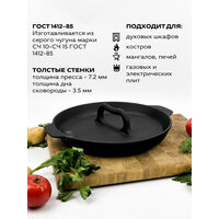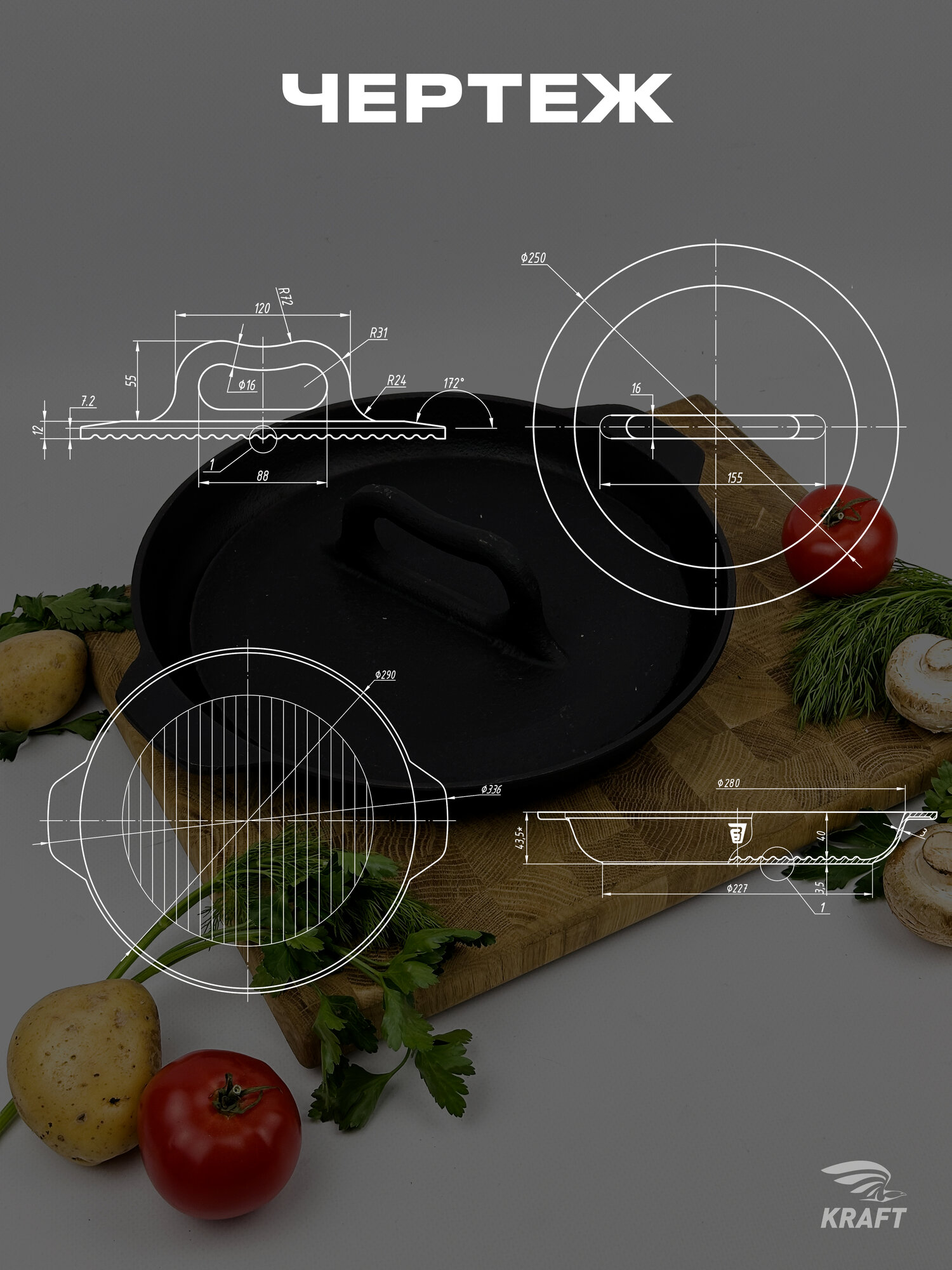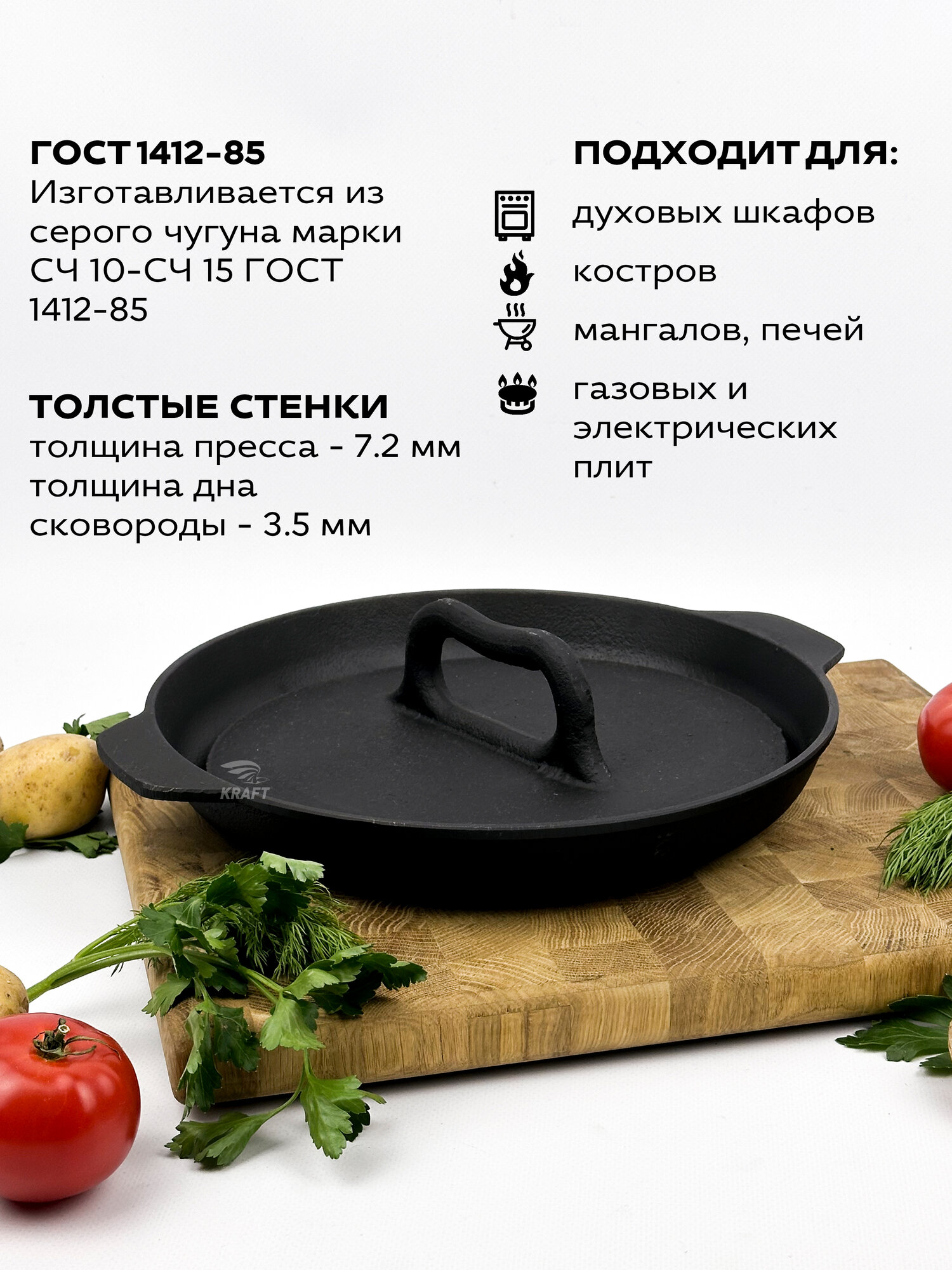 Чугунная сковорода с крышкой пресс-гриль: идеальный выбор для настоящих кулинаров Представляем вам чугунную сковороду диаметром 28 см в комплекте с крышкой пресс-гриль — незаменимый помощник на вашей кухне! Изготовленная из серого чугуна, эта сковорода соответствует стандартам ГОСТ и гарантирует высокое качество и долговечность. Одним из главных преимуществ чугунной сковороды является равномерное распределение тепла, что позволяет готовить блюда до совершенства. Она идеально подходит для приготовления цыпленка тапака, а также других мясных и овощных блюд. Благодаря крышке пресс-гриль, вы сможете добиться идеальной корочки и сохранить все соки внутри, что сделает ваши блюда особенно вкусными. Эта сковорода универсальна в использовании: она подходит для духовки, печи, костра, а также для газовых и электрических плит. Вы можете готовить на ней как на плите, так и в духовке, что открывает перед вами множество кулинарных возможностей. Чугунная сковорода — это не просто посуда, это инвестиция в ваше здоровье и кулинарные навыки. Она не только долговечна, но и позволяет готовить без использования лишнего масла, сохраняя все полезные вещества в продуктах. Не упустите возможность улучшить свои кулинарные навыки! Заказывайте чугунную сковороду с крышкой пресс-гриль уже сегодня и наслаждайтесь вкусными блюдами каждый день!