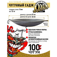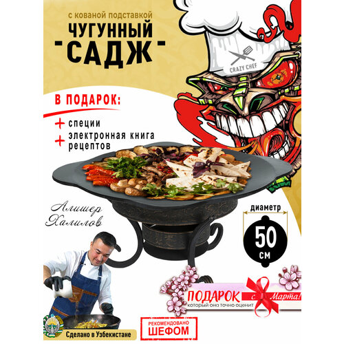 Садж чугунный с подставкой имеет круглую форму и выпуклое дно. Садж с подставкой для углей идеален для приготовления восточных блюд. Обратная сторона узбекской посуды может использоваться для выпекания лепешек или лавашей. Сковороду из чугуна используют на мангале, на газовой плите и на специальной печи. Также садж чугунный 50 может использоваться в качестве крышки для узбекского чугунного казана или для жарки шашлыка, необходимо лишь подобрать нужный размер. Чугун саджа равномерно прогревается и долго сохраняет полученное тепло. Гриль не боится перегрева. Садж для костра может находиться на открытом огне часами и при этом не бояться деформации. Конструкция способствует тому, сковорода с двумя ручками долго не остывает, а пища на ней долго остается горячей. При правильном уходе она со временем не портится, а становится только лучше. Чем активнее вы используете вок, тем быстрее появляется защитный слой, позволяющий забыть о пригорании пищи и о ржавчине. Сотейник имеет стенки толщиной 8-9 мм в зависимости от диаметра. Перед использованием его необходимо обжечь и прокалить согласно инструкции, которая идет в комплекте. Азербайджанская сковородка в поход универсальна и проста в использовании и подойдет для походной кухни, а также станет дополнением казана в качестве крышки. Если Вы истинный ценитель отдыха на природе и туризмпоходов обязательно дополните сковороду садж с ручками печкой от бренда Крейзи Шеф, которые так же могут быть использованы при приготовлении мяса и овощей. Плоская сковорода для плова с подставкой уже в наличии! Чугунный инвентарь - оригинальный подарок мужчине на 23 февраля или женщине без повода. Туристическая сковорода для костра подойдет в качестве подарка как настоящему мужчине, так и женщине