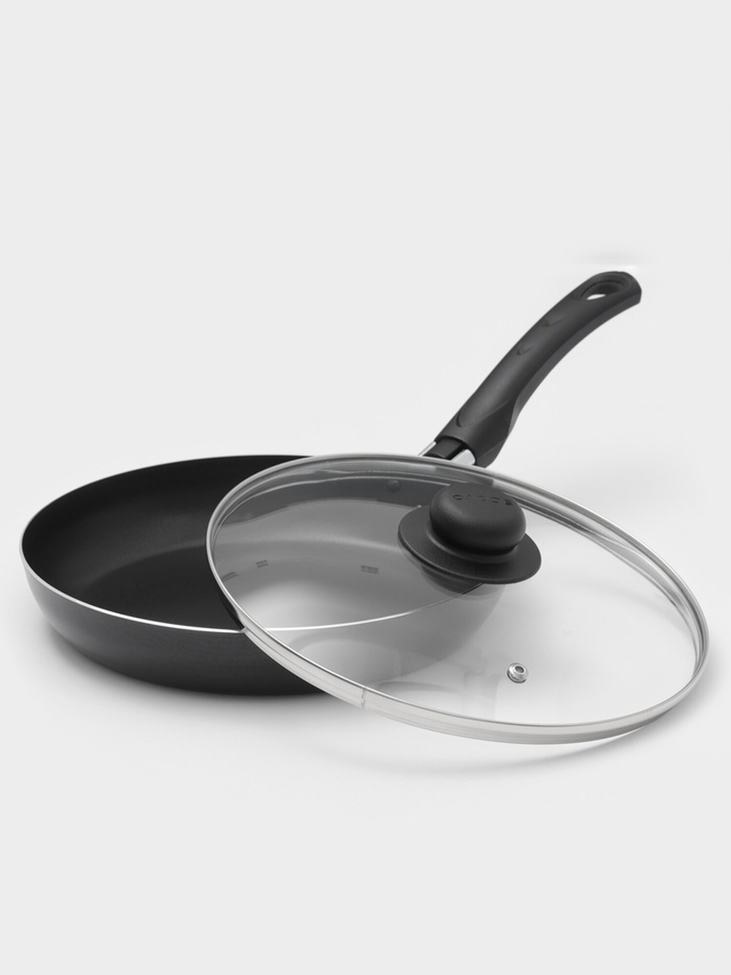 Удобство использования: Сковорода оснащена удобной фиксированной ручкой из пластика, которая не нагревается во время приготовления пищи. В комплекте идет стеклянная крышка, которая позволяет сохранить аромат и влагу продуктов.