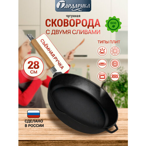 Чугунная посуда гардарика является незаменимым помощником на любой кухне, так как подходит для всех типов плит, обладает своими преимуществами перед другими видами посуды, соединяя в себе высокое качество и износостойкость, не боится металлических кухонных инструментов. Полезным свойством чугуна является долгое сохранение тепла. Такой эффект создается за счет толстых стенок и дна, при этом тепло распределяется постепенно и равномерно, что позволяет еде готовиться не подгорая. В чугунной посуде можно пассеровать овощи, обжаривать мясо и рыбу, тушить и выпекать любые виды блюд в духовке (если снять ручку). Когда вы жарите на чугуне, то готовится не только та часть продукта, которая касается поверхности, но и значительная часть над ней. Блюда, приготовленные в чугунной посуде, имеют особый неповторимый вкус. Чугунная посуда долговечна. Она выдержит все ваши кулинарные эксперименты и будет служить десятки лет. Также можно отметить, что чугунная посуда экологически чистая, безопасна для здоровья. Благодаря съемной ручке сковороды гардарика можно поставить в холодильник или поместить в небольшой кухонный шкаф. Деревянная ручка не нагревается. Приятного всем аппетита! Посуда из чугуна станет хорошим подарком. Ее можно преподнести бабушке, дедушке, маме, дочери, мужу, любимому, любимой, молодому человеку, девушке, на Новый год, годовщину свадьбы, 8 марта и любой другой праздник.