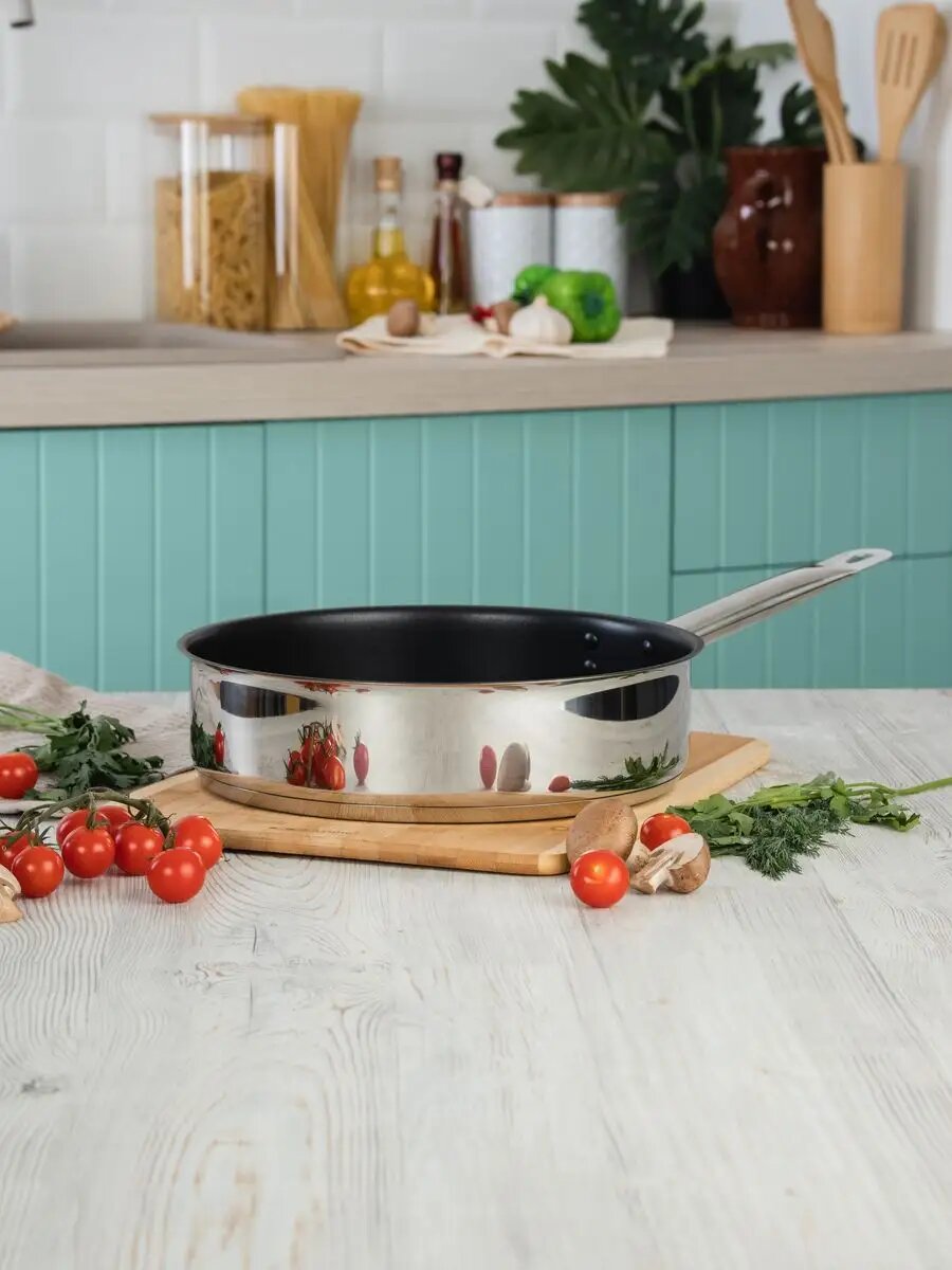 Сковорода глубокая из нержавеющей стали с антипригарным покрытием - стильное решение для Вашей кухни. Сотейник антипригарный идеально подходит для индукции, нагревается быстрее алюминиевых аналогов, т. к. дно полностью выполнено из стали. Следовательно, меньше расходуется энергия. Утолщенное дно равномерно распределяет тепло и сохраняет его, так же способствую более быстрому приготовлению пищи. Благодаря антипргарному покрытию можно готовить практически без использования масла и сделать своё меню более диетическим и полезным. Сотейник отлично подходит как для жарки, так и для тушения. Диаметр сковороды 20 см, диаметр дна 18 см, высота борта 6 см. Подходит для всех типов плит, включая индукцию. Можно использовать в посудомоечной машине.