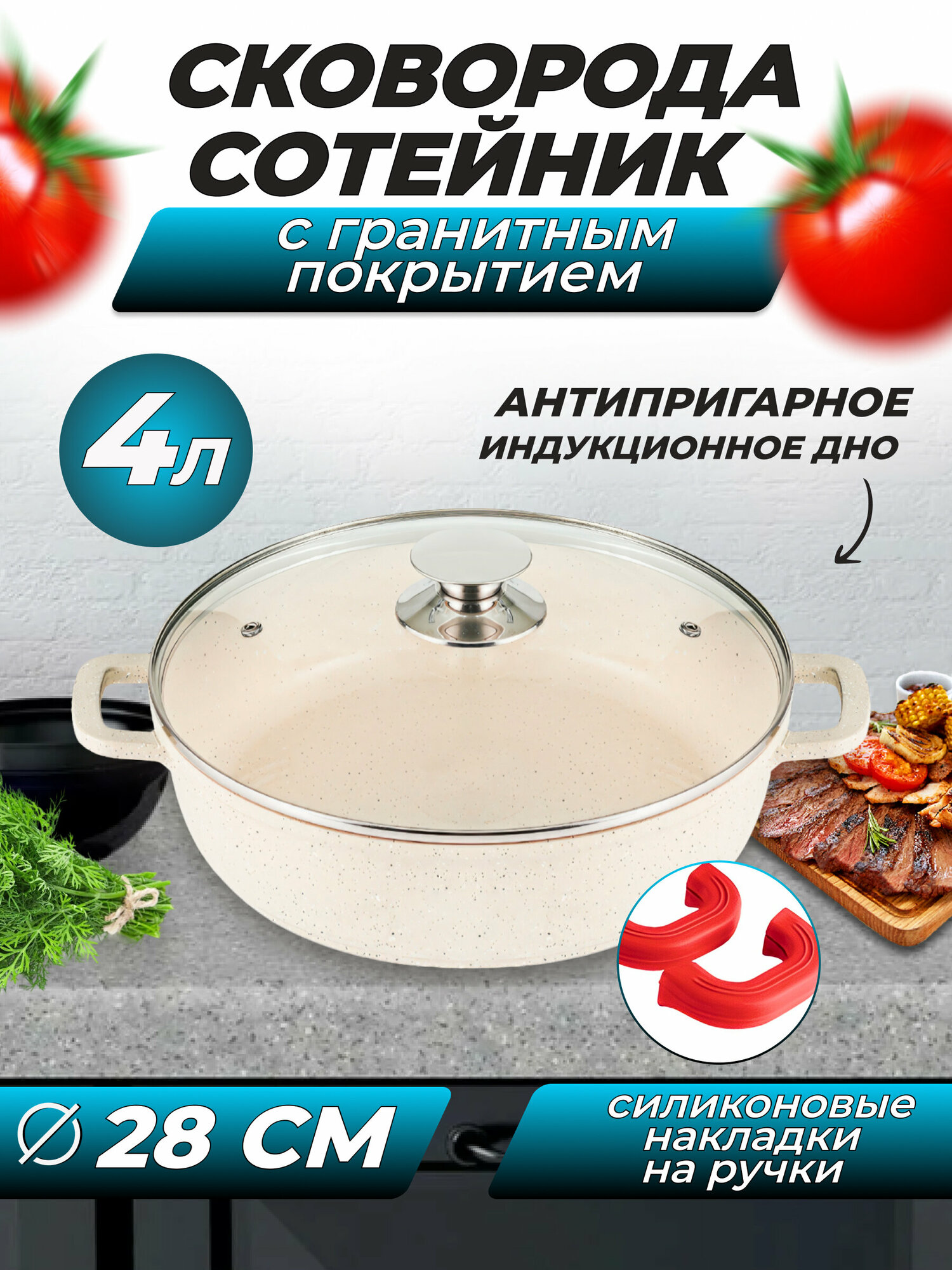 Жаровня диаметром 28 см из пищевого алюминия на 4 литра просто необходима хозяйке на кухне! Товар безупречного качества по доступной цене. Изделие универсальное: может применяться как сковородка с высокими бортами, сотейник, кастрюлька. Ее можно ставить в духовку: покрытие очень прочное и выдержит высокие температуры. Посуда имеет толстые стенки и дно. Можно жарить и тушить как в сковороде с каплей масла и еда не пригорит, или пользоваться как кастрюлей для варки и тушения. Жаровня ни в чем не уступает чугунным аналогам: позволяет готовить разнообразные блюда, запекать в духовке или для приготовления на газовой плите. Антипригарная кастрюля жаровня под овощи, для мяса, для супа, для молока, для рыбы будет отлично смотреться в вашем интерьере! Такая жаровня мечта каждой хозяйки и хозяина, это идеальная жаровня для мангала. Технология ручного литья под давлением позволяет увеличить срок эксплуатации посуды, поэтому наши кастрюли отличаются своей долговечностью и простотой в уходе. Классическая жаровня - сковорода с толстым дном прослужит вам долго, если не применять металлические приборы и не применять в мытье абразивные вещества. Используйте только деревянные, пластиковые или силиконовые лопатки и другие кухонные инструменты. Жаровник для духовки, казан можно использовать ежедневно и она всегда будет радовать вас вкусными блюдами! Лучшие сковородки и кастрюли Вы найдете перейдя в наш магазин, там вас ждут всевозможная посуда для кухни и кухонная утварь: ковши, сковородки-гриль для блинов, кастрюли и многое другое. Наша жаровня поможет вам определиться с подарком женщине на Новый Год, 8 марта, на день рождения или 23 февраля любимому парню, мужу, папе или дедушке, это незаменимый подарок для мужчин. Ее можно брать с собой в рыболовный лагерь, на отдых на природе, она станет незаменимым помощником в походной кухне или с легкостью приготовить на газу. Это настоящий как мужской подарок так и женский, мечта вашей сильной половинки.