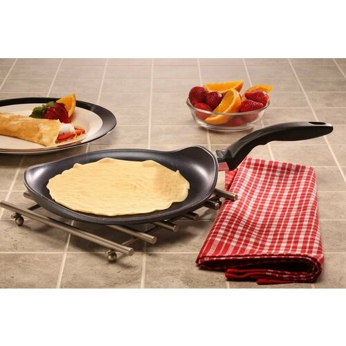 Сковорода диаметром 26 см с низкими бортиками - предназначена для приготовления блинов, а также идеально подходит для приготовления омлетов и французских тостов. Особая форма бортиков позволяет легко перевернуть блюдо и облегчает сервировку. Сковорода оснащена сбалансированной фиксированной рукояткой с отверстием для подвешивания. Корпус выполнен из сплава алюминия и кремния методом литья под высоким давлением с последующей пескоструйной шлифовкой и плазменным напылением для усиления адгезии внешнего покрытия, рукоятка – из термостойкого бакелита. Подходит для индукции.