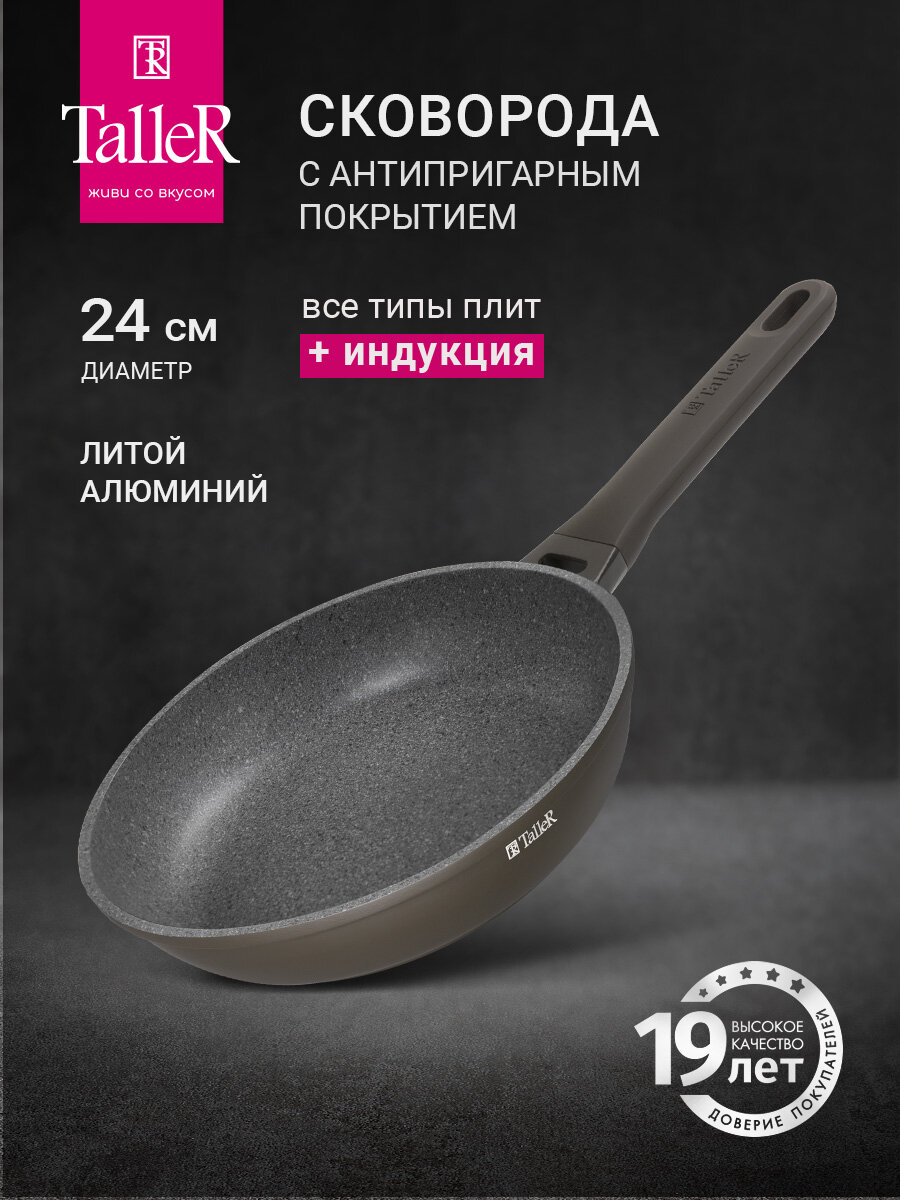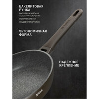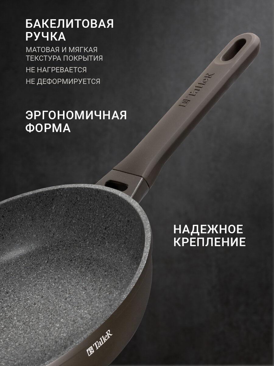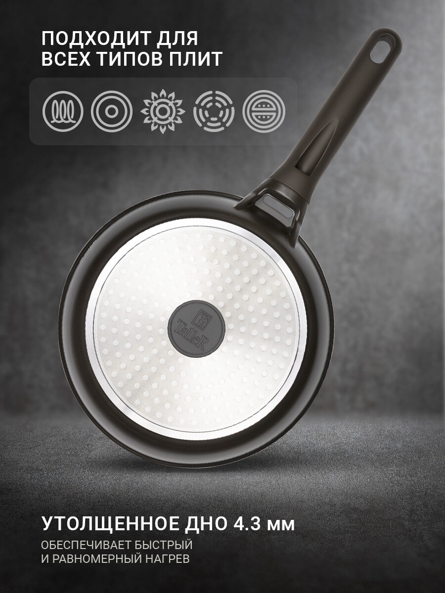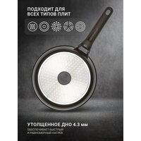 Сковородка изготовлена из качественного алюминия с многослойным антипригарным покрытием, которое не содержит PFOA, что позволяет готовить без масла, сохраняя вкус и пользу продуктов. Она подходит для всех типов плит: индукционной, газовой, стеклокерамической и электрической, благодаря чему является универсальным решением для любой столовой.