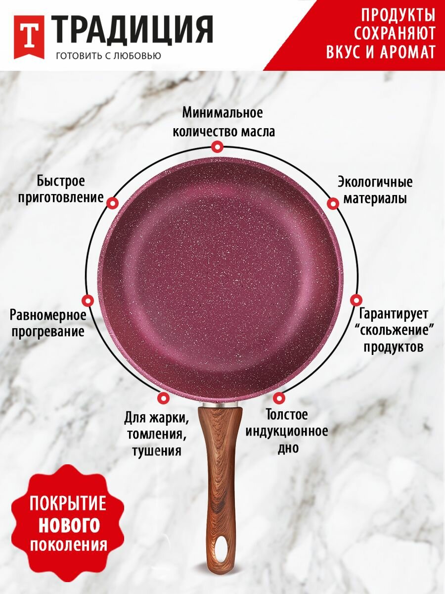 Вдохновляясь модными тенденциями и актуальными трендами в дизайне, мы создали современную линейку антипригарной посуды серии Рубин ТМ "Традиция готовить с любовью". Влияние цветотерапии на нашу жизнь зачастую недооценивается. Красный цвет символизирует огонь, жизнь, энергию. Все оттенки красного и малинового цветов вызывают положительные эмоции, а это именно то, что сейчас нам всем надо. Даже у начинающего кулинара еда будет казаться шедевром на красивой и яркой посуде! Сковороды серии Рубин станут любимым предметом и самым надежным помощником на кухне, поскольку предназначены для частого использования, жарки и тушения продуктов. Толщина дна и стенок оптимальна, чтобы обеспечивать хорошую теплопроводность и равномерный нагрев, без утяжеления изделия. Многослойное антипригарное покрытие на водной основе не содержит PFOA не только безопасное, но и красивое. Оптимальная высота бортов делают эту посуду идеальной для приготовления блюд, в которых достаточно много жидкости или объема. Можно готовить на всех варочных поверхностях, в том числе и индукционной. Приятным дополнением к удобному корпусу сковороды стала эргономичная ручка из термостойкого пластика с «бархатным» эффектом Soft Touch под дерево. Ручкой удобно пользоваться: она не нагревается во время приготовления и удобно лежит в руке, не выскальзывая. За сковородой легко ухаживать вручную, а также можно мыть в посудомоечной машине. Соберите собственный набор сковородок Рубин любого размера. Посуда для кухни – очень важная составляющая, которая подарит комфорт и уют, а посуда для приготовления – это то, чем мы пользуется почти ежедневно. Красивая и функциональная кухонная утварь служит прекрасным подарком на день рождения, юбилей, на Новый год, на свадьбу, на 8 марта, на новоселье и просто порадовать без повода.