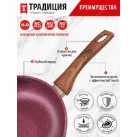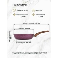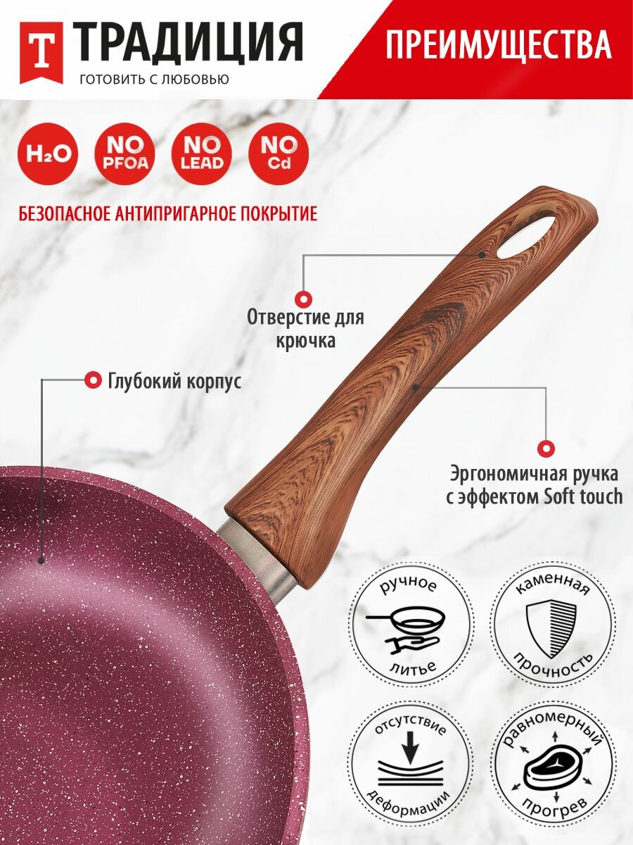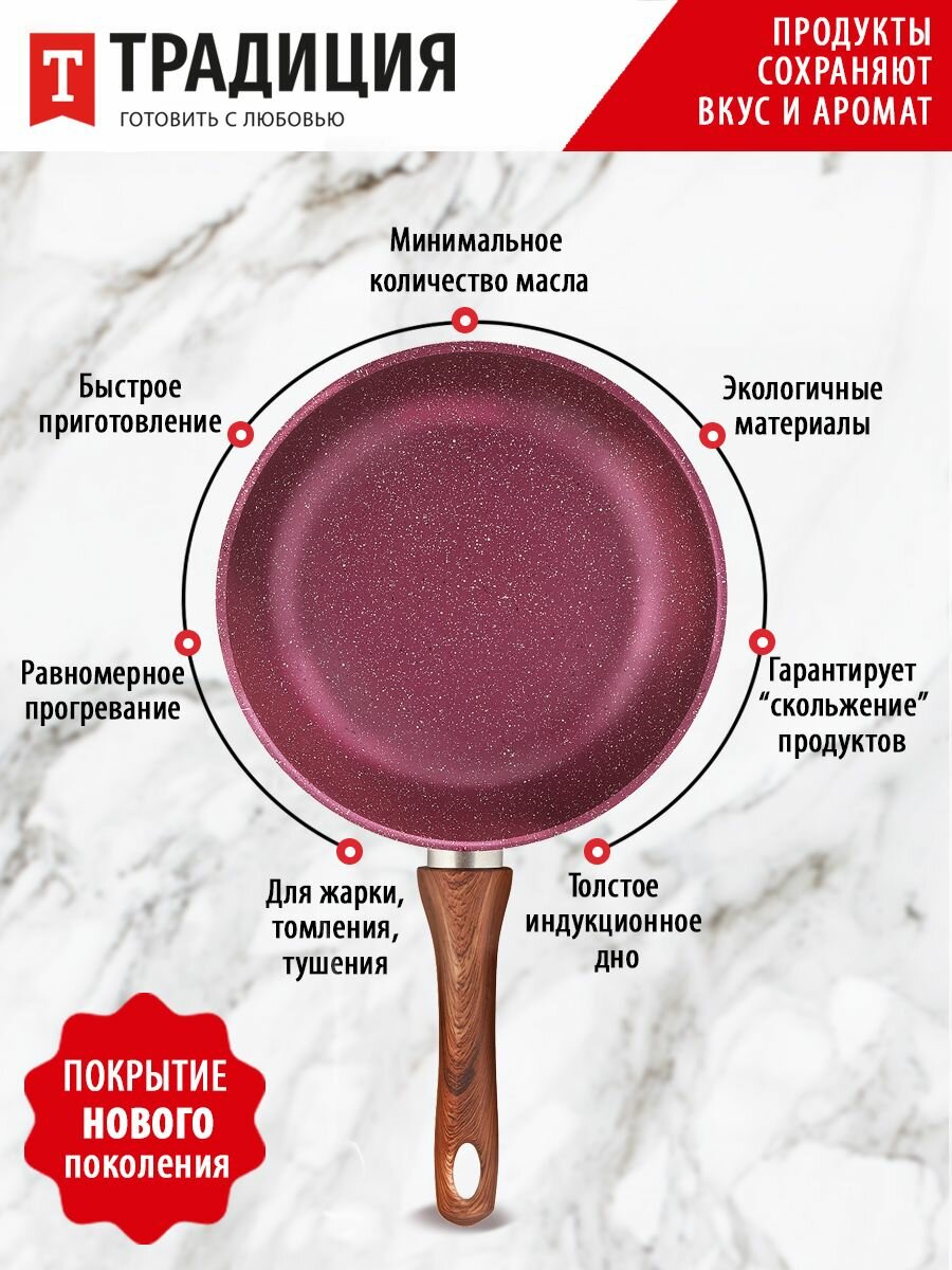 | Дополнительная информация | Сковорода подходит для всех типов плит, имеет утолщенное дно 4 мм для равномерного прогрева и высокие бортики 5 см для удобства приготовления |