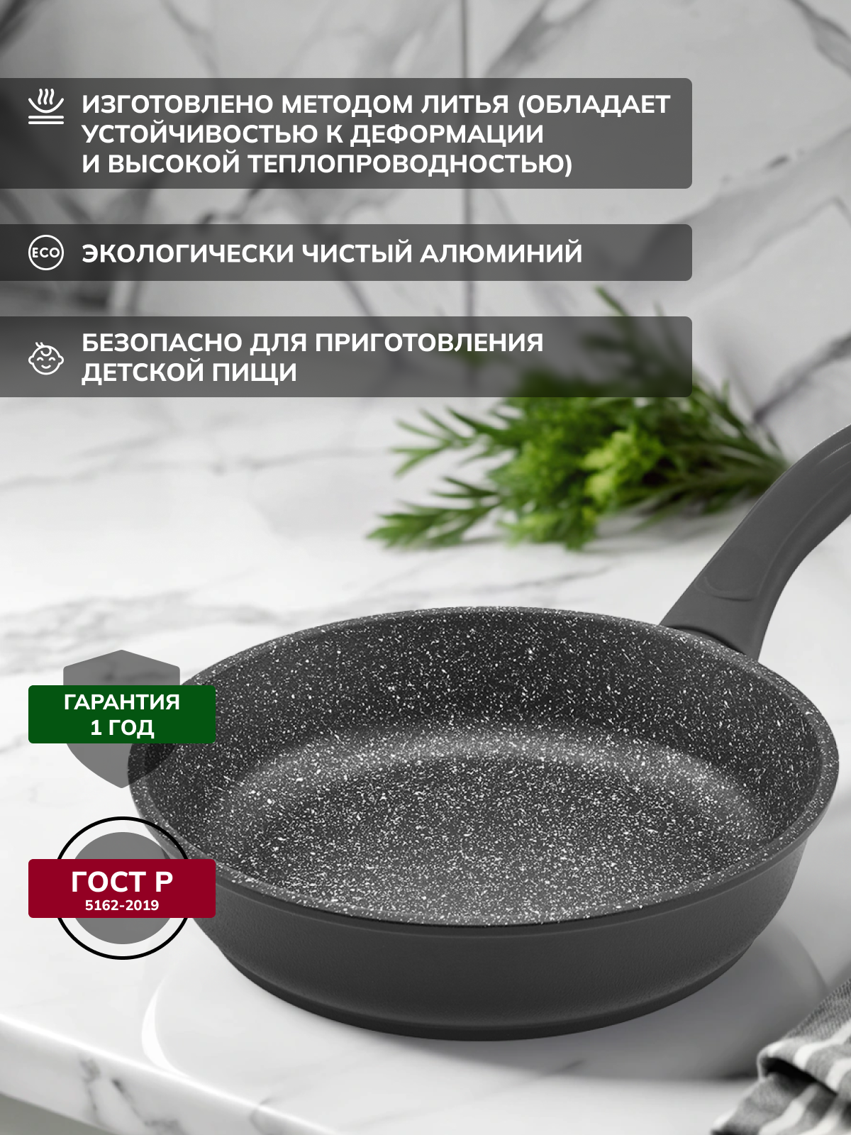 Сковорода Victoria изготовлена по ГОСТ, что гарантирует высокое качество и надежность изделия. Ее усиленный бортик и литая конструкция обеспечивают долгий срок службы сковороды. Толщина дна 5 мм обеспечивает равномерное распределение тепла.