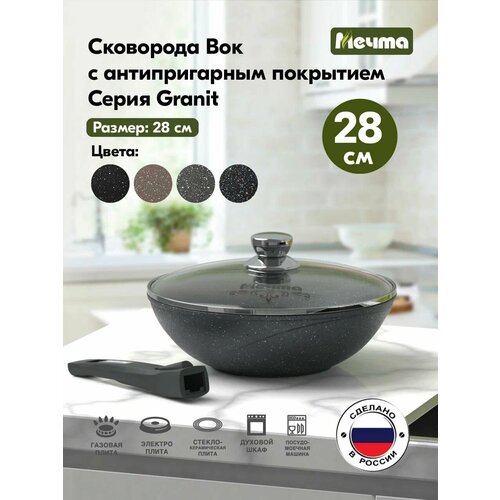 Купить Сковорода ВОК «Мечта» 28см Гранит с антипригарным покрытием со съемной ручкой и крышкой, можно мыть в посудомоечной машине с доставкой по всей России.