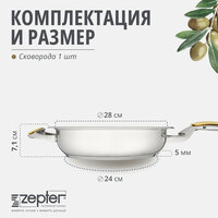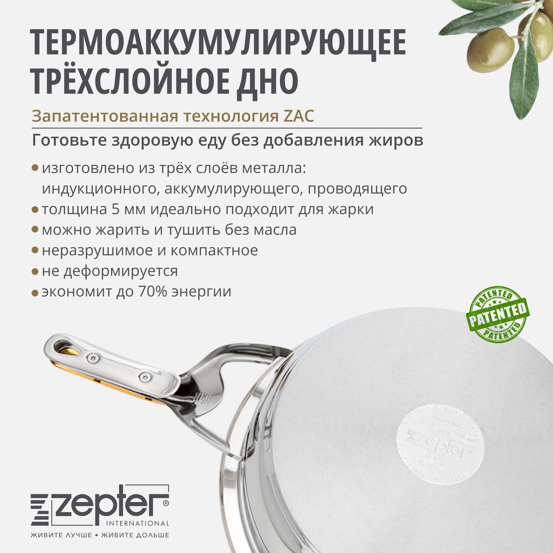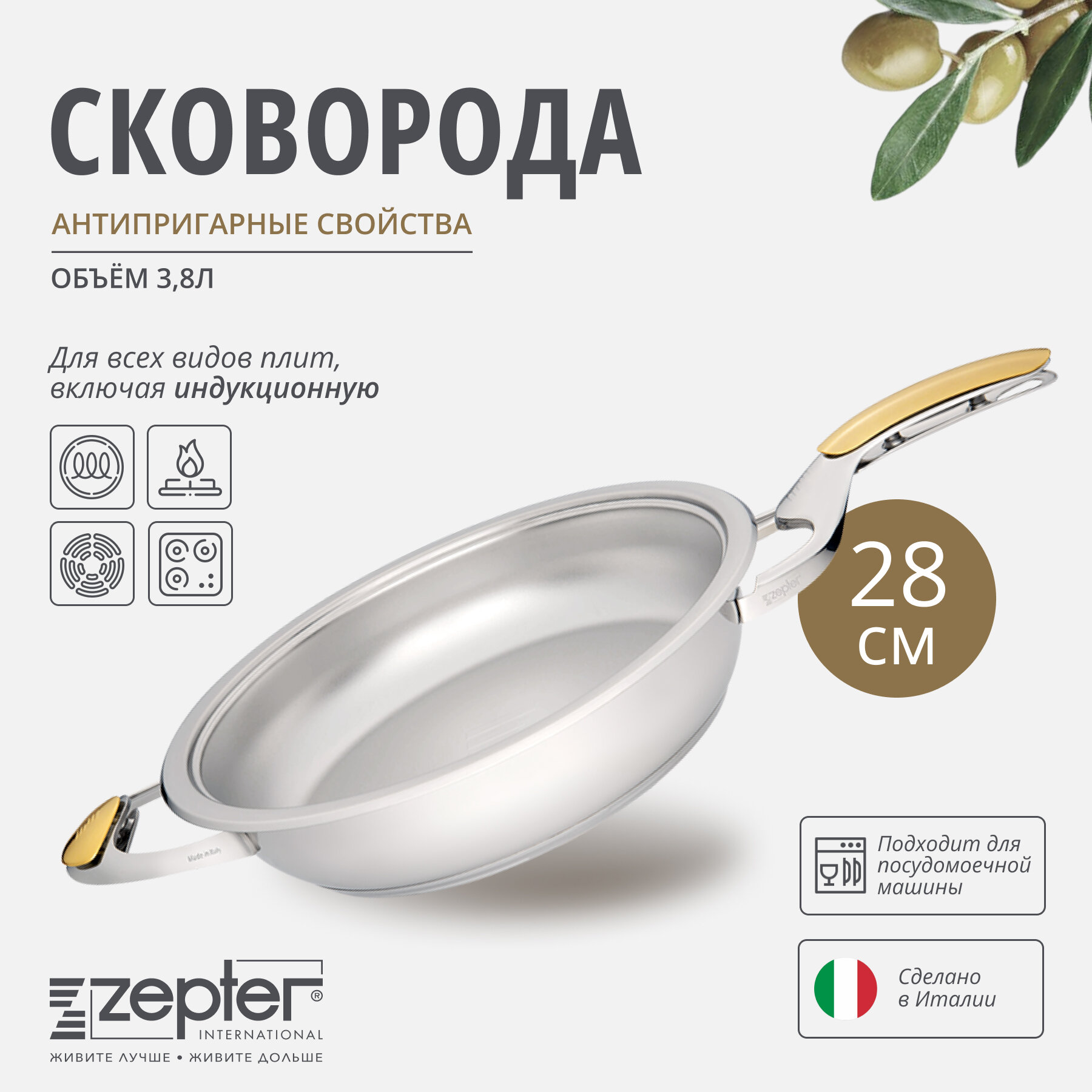 Сковорода без крышки с 2-мя ручками из нержавеющей стали 3,8 л, диаметром 28 см и высотой 6,5 см от ZEPTER выполнена из превосходного металла 316L, устойчива к повреждениям, коррозии, не впитывает запахи и вкусы продуктов.