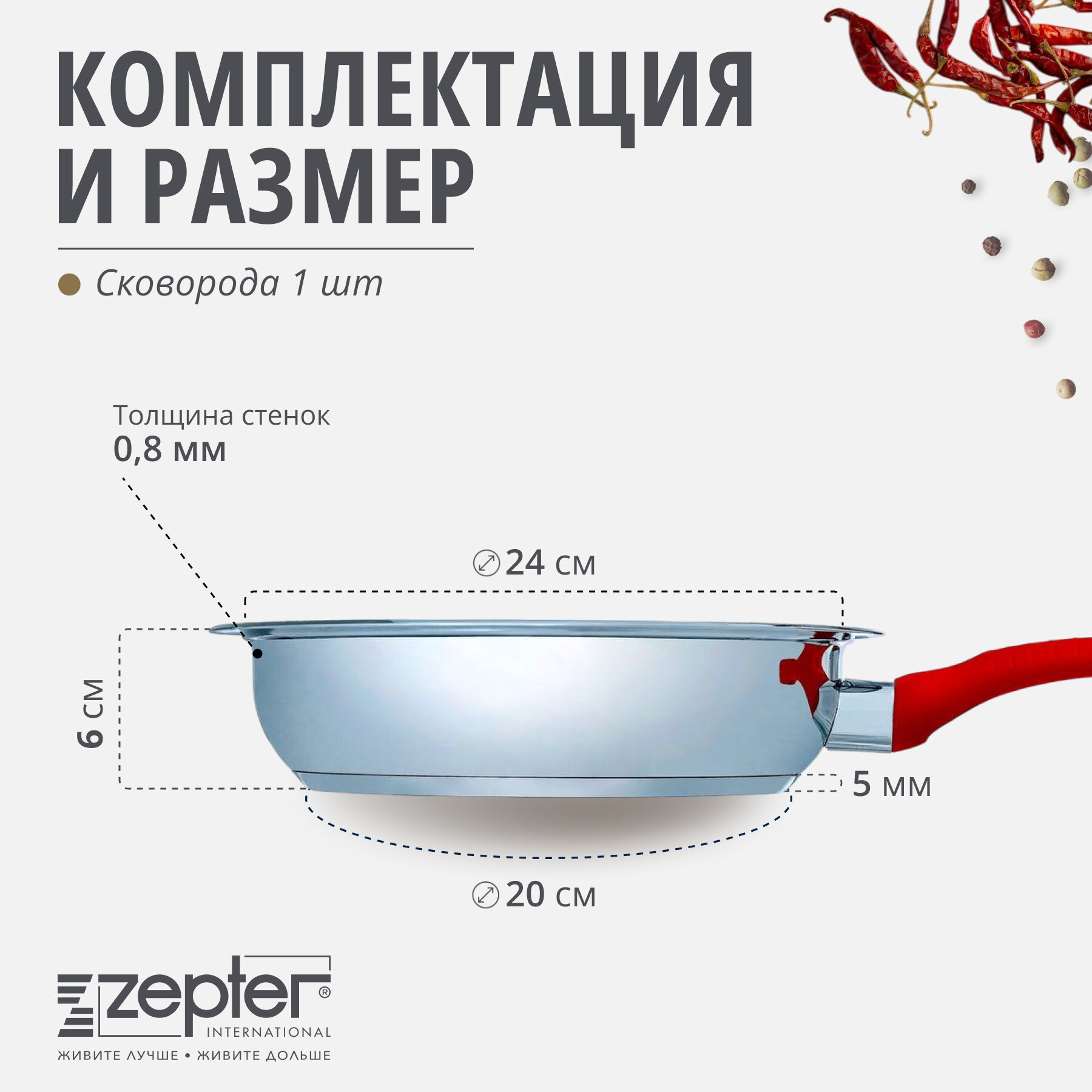 Сковорода Zepter Ø24 см, объем 2,5 л, с фиксированной ручкой покрытой термостойким бакелитом из нержавеющей стали.