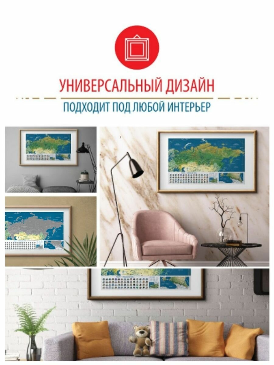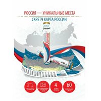 Это идеальный подарок для юных исследователей, которые любят путешествовать и познавать новое. На самой карте отмечены пиктограммы - место каждой из 60 достопримечательностей. На легенде карты вы можете выбрать уникальное место в России и стереть скретч слой с кружка, чтобы узнать чем оно примечательно. Посетите это уникальное место и сотрите его уже на самой карте. Так вы будете вести свой подсчёт посещения уникальных российских мест как дневник путешественника и туриста. Карта мира отличное дополнение к интерьеру квартиры, офиса или кафе. Подберите фоторамку или багет и повесьте на стену.