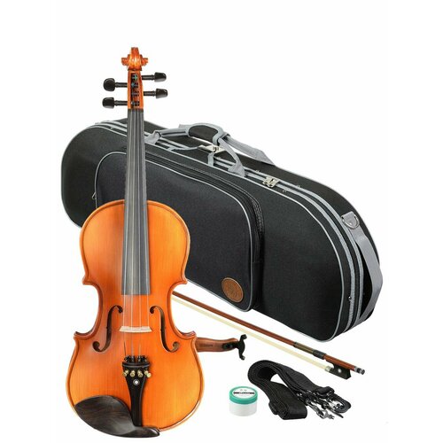 При работе были использованы только качественные материалы. Это сделало скрипку обладательницей уникального чистого звука. Верхняя дека этого инструмента изготовлена из массива резонансной ели, а нижняя дека и обечайки - из волнистого клёна, поэтому извлекаемый звук отличается глубиной и резкостью. Этот инструмент собран и покрыт лаком вручную. Особенным этот инструмент делает и цвет - золотисто-коричневый с янтарным отливом. На скрипку установлен комплект струн средней жёсткости. Струнодержатель этой модели изготовлен из эбони с инкрустацией, оснащён 4мя машинками для тонкой настройки струн.