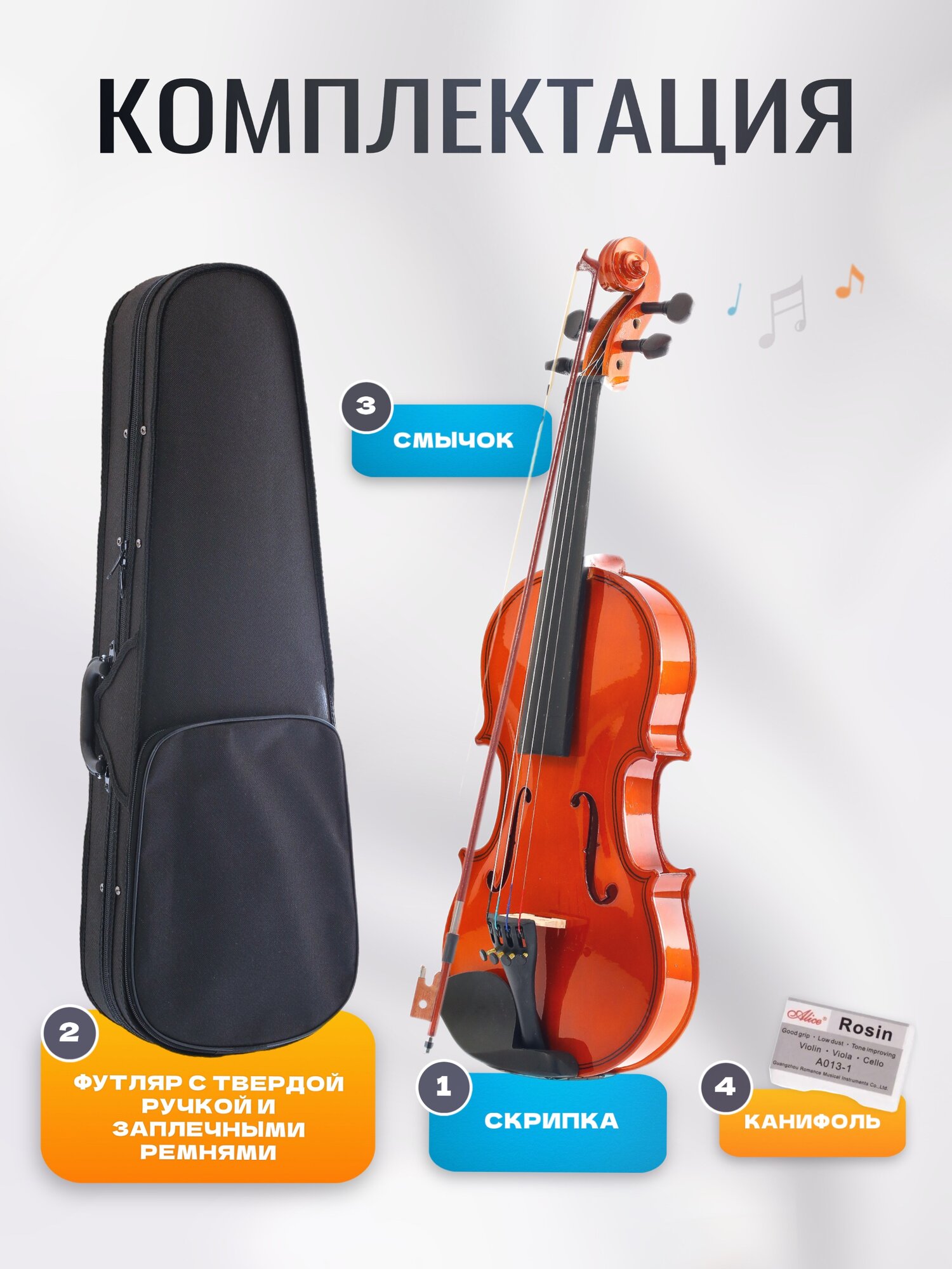| Комплектация | канифоль, кейс, подбородник, смычок |