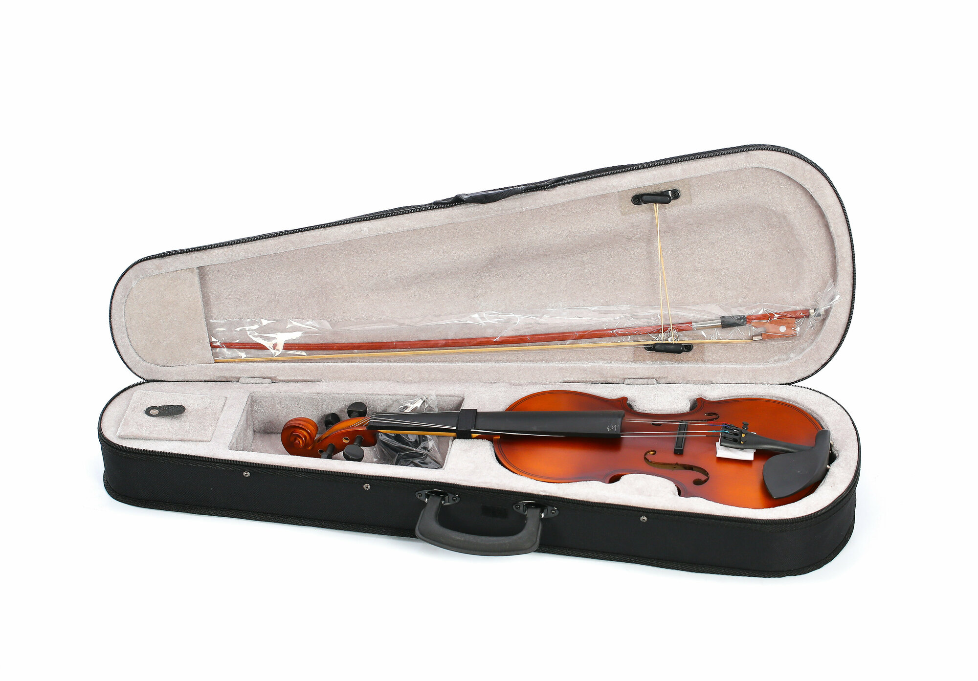 В комплект скрипки Fabio SF-34015E (1/2) входят: скрипка, смычок, футляр и канифоль. Футляр обеспечивает безопасное хранение и транспортировку инструмента, а канифоль помогает быстро настроить скрипку после игры.