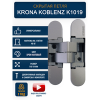 Kombi Hybrid K 1019 от Krona Koblenz . Скрытая петля из высокопрочной стали, полимера и сплава ZAMAK для внутренних дверей заподлицо со стеной и коробок из дерева, стали, алюминия. Грузоподъемность до 40 кг с двумя петлями. Угол открывания до 180°, минимальная толщина двери 32 мм, износостойкие втулки, не требующие смазки/обслуживания, реверсивные для правой/левой двери. Трех сторонняя регулировка: по горизонтали +3/- 1,5 мм, по вертикали +/- 2,5 мм, по плоскости +/- 1 мм.