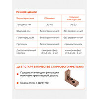 Скрытый крепеж Гвозdeck Дуэт Старт – это идеальное решение для тех, кто ценит эстетический внешний вид своих конструкций и надежность крепления. В упаковке вы найдете 40 высококачественных элементов, которые обеспечат прочное соединение и скрытое крепление без видимых элементов на поверхности.