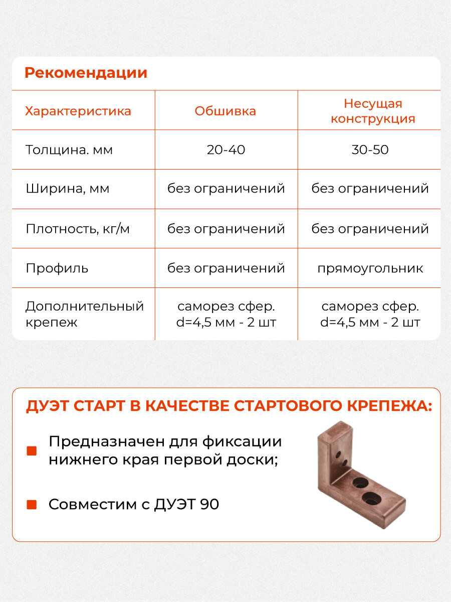 Стартовый элемент Гвозdeck дуэт старт используется вместе с любым типом скрытого крепежа линейки дуэт (90, 70, 30, фасад) или самостоятельно.