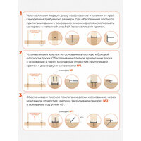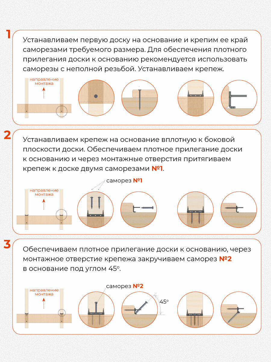 -Форма крепежа обеспечивает требуемый монтажный зазор между досками; В качестве основания может быть использована любая деревянная лага (брусок) или металлопрофиль; -Позволяет использовать в качестве лаги (бруска) террасную доску или брусок сечением сопоставимым с длиной самореза, что удобно для устройства деревянного настила по бетонному основанию; -Меньший монтажный зазор между террасными досками по сравнению с Гвозdeck Твин, менее заметен; -Вентиляционный зазор между палубной или террасной доской выходит от 4 мм до 7 мм, что позволяет избежать смыкание доски с последующим ее короблением. -Низкая вероятность раскалывания террасной доски;