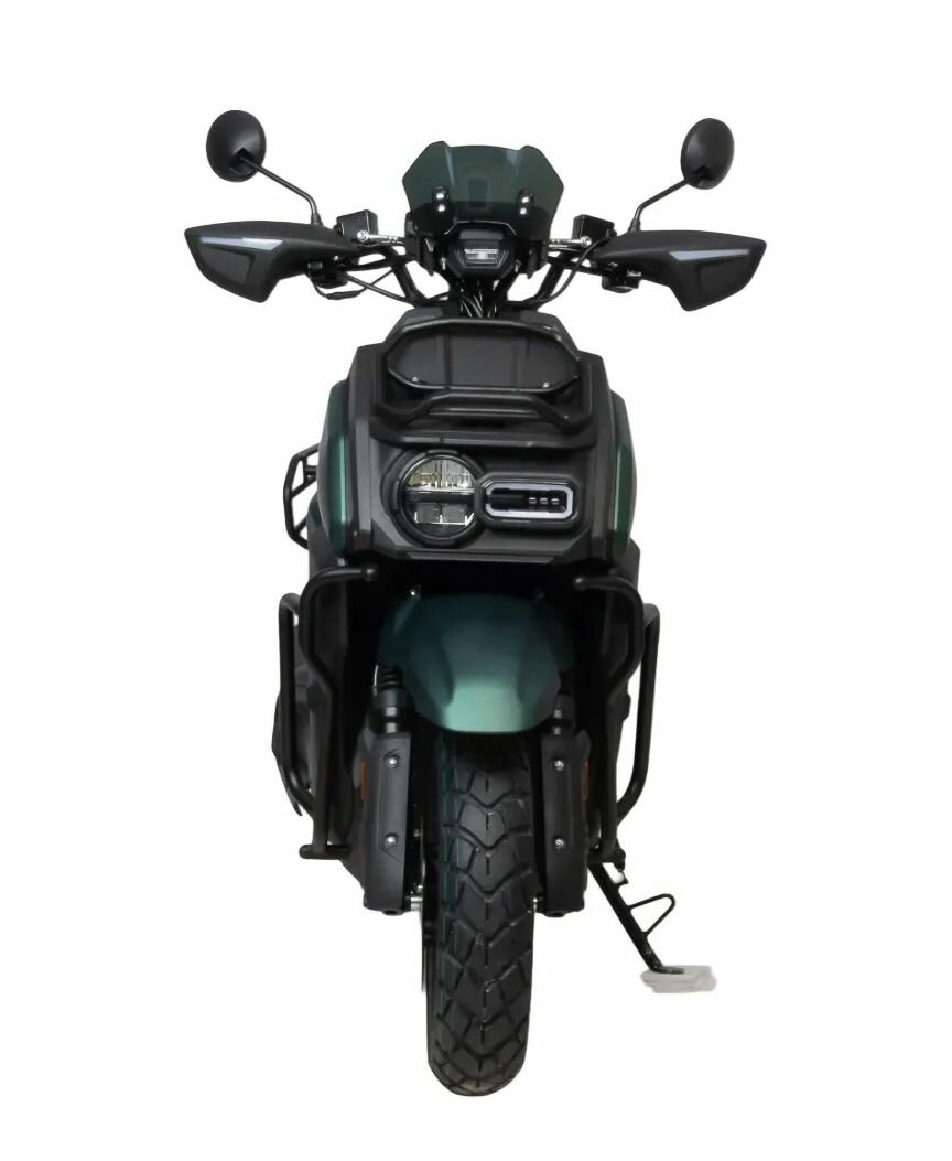 Мощный скутер Motoland Tank 150 — это отличный вариант для загородного катания и поездок на рыбалку: имеет множество дополнительных защит и закрытий, колеса 12" с резиной для поездки по грунтовой дороге и асфальту. Брутальный внешний вид и черный цвет делает его не похожим на другие скутера. Дополнительные ДХО, светодиодные поворотники и стоп-сигнал. На скутере установлен одноцилиндровый четырехтактный двигатель 157 QMJ мощностью 10 л/с и рабочим объемом 150 см3 с принудительным охлаждением, что позволяет ему не перегреваться даже в сильную жару. Система запуска кикстартер + электростартер. Трансмиссия - вариатор, не требующий манипуляциях с переключением скоростей. Это очень удобно при эксплуатации и не вызывает сложностей, просто сел, повернул ручку газа и поехал. Все тормоза - дисковые гидравлические. Подвеска - передняя вилка телескопическая и два задних амортизатора. Колесные диски литые алюминевые, на которые установлены качественные покрышки 120/70-12". Выдерживает нагрузку до 150 кг, что позволяет перевозить одного пассажира. Под сиденьем есть большое багажное отделение + площадка для крепления дополнительного кофра. Приборная панель — электронная, с очень крупными, легко читаемыми цифрами и часами; со всеми необходимыми указателями. Габариты: 1900 х 710 х 1170 мм (без учета зеркал) Габариты в коробке - 1850х560х700 мм Высота по седлу - 750 мм Высота до руля -1050 мм