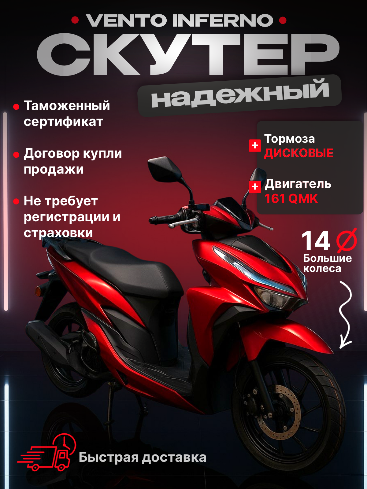 Скутер VMC «VENTO INFERNO», с электростартером, максимальная скорость до 100 км/час: сравнение цен, характеристики, фото, актуальное наличие и цены.