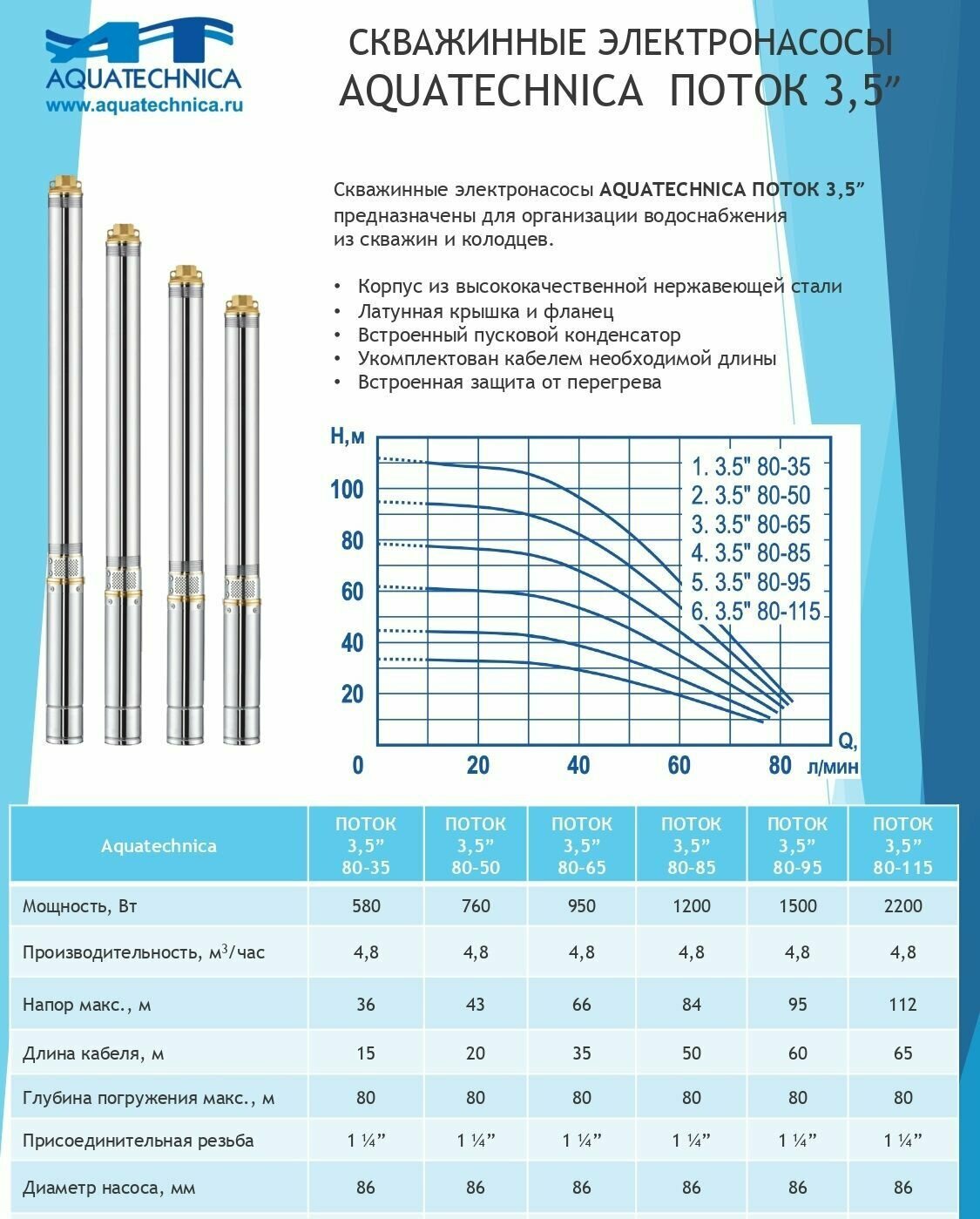 защита от перегрева, плавный пуск двигателя, повышение давления