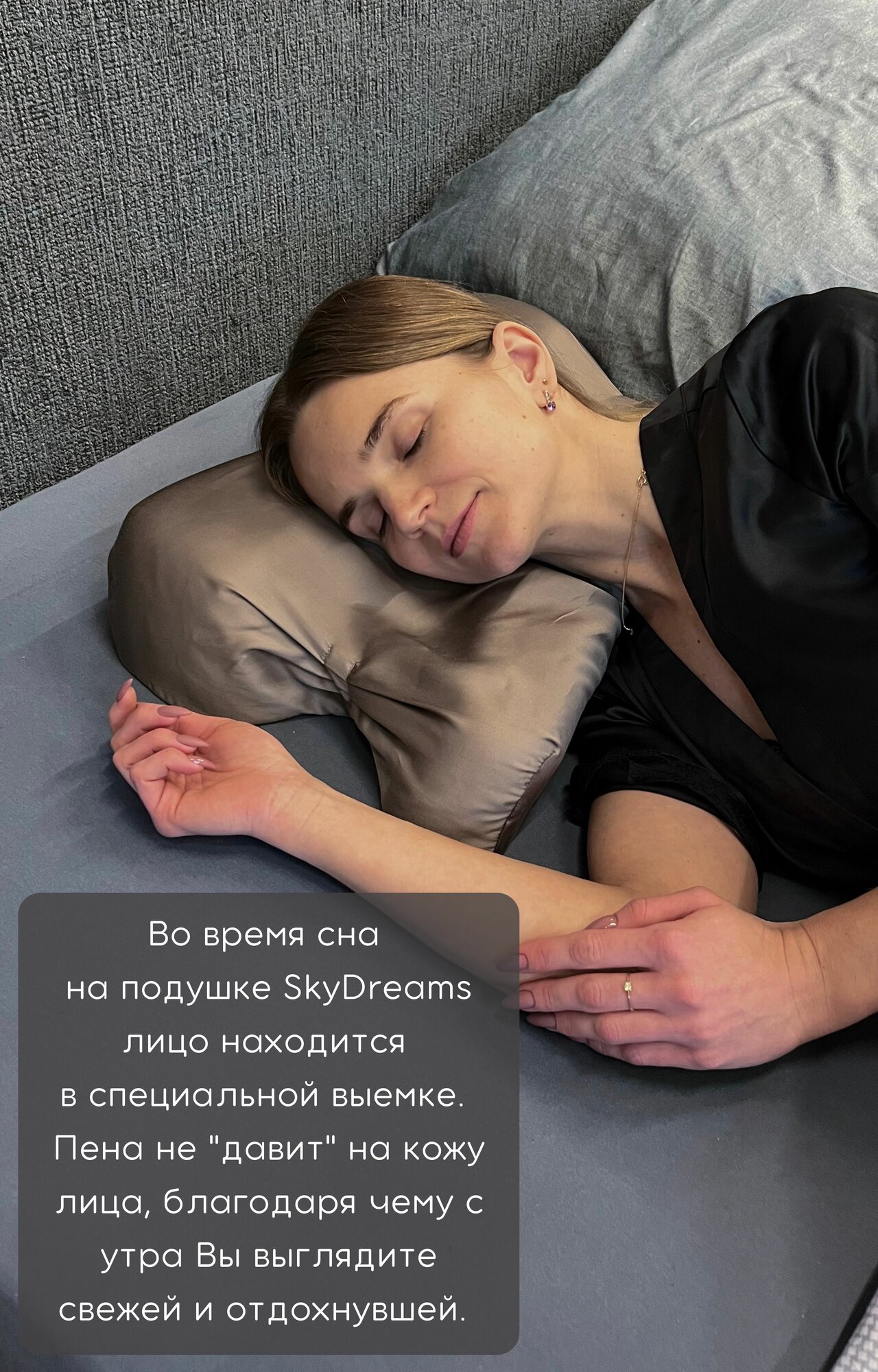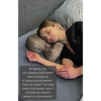 Подушка SkyDreams выполнена из специальной пены с эффектом памяти, тем самым учитывает все индивидуальные особенности человека, а также заботится о Вашей коже во время сна, предупреждая развитие и формирование новых морщин. Для этого по краям подушки есть выемки для лица, благодаря которым подушка не оказывает давления на кожу и препятствует появлению отеков и заломов на лице после сна.