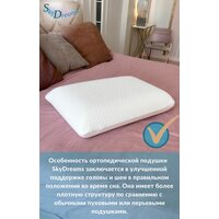 Преимущества ортопедической подушки SkyDreams: • Классическая форма подушки не требует длительного привыкания • Улучшают качество сна – правильное положение головы и поддержка шеи обеспечивает ровное положение позвоночника во время сна. Вы станете реже просыпаться, сон будет крепким, а значит с утра Вы будете чувствовать себя отдохнувшим • Разгружает мышцы шеи и плечевого пояса, предотвращает их затекание • Используется для профилактики бессонницы, коррекции осанки, для избавления от храпа или снижения его частоты • Во время сна на подушке SkyDreams отсутствует давления на мягкие ткани, что помогает сохранить молодости кожи