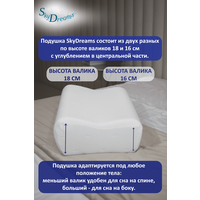 Подушка SkyDreams состоит из двух разных по высоте валиков 16 и 18 см с углублением в центральной части. Подушка адаптируется под любое положение тела: меньший валик удобен для сна на спине, больший — для сна на боку.