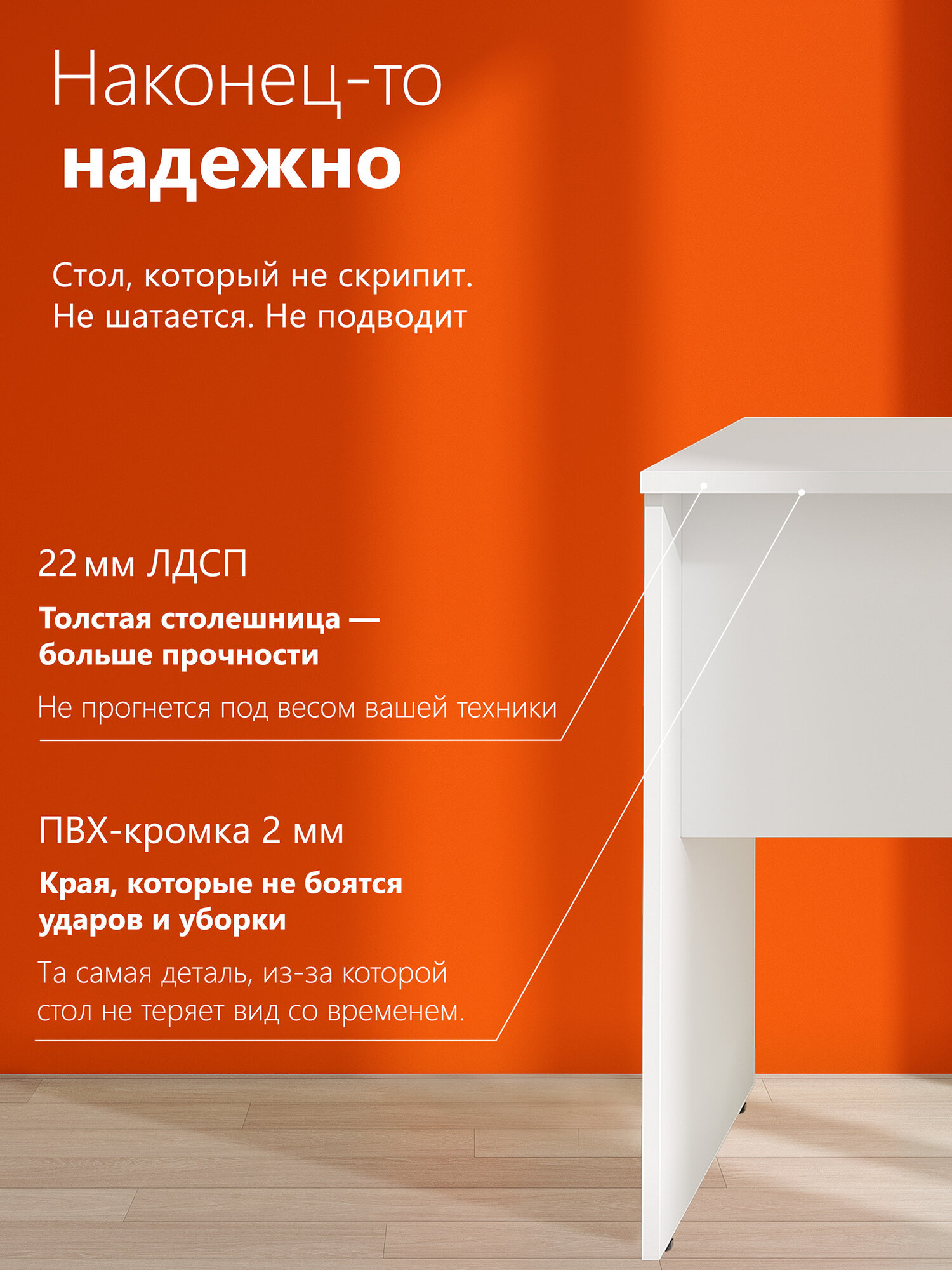 Рабочий стол оснащен солидной столешницей 22 мм и прочными опорами 18 мм из ЛДСП. Противоударная кромка ПВХ толщиной 2 мм защищает торцы письменного стола от повреждений. А регулируемые по высоте опоры обеспечат устойчивость на неровном полу.