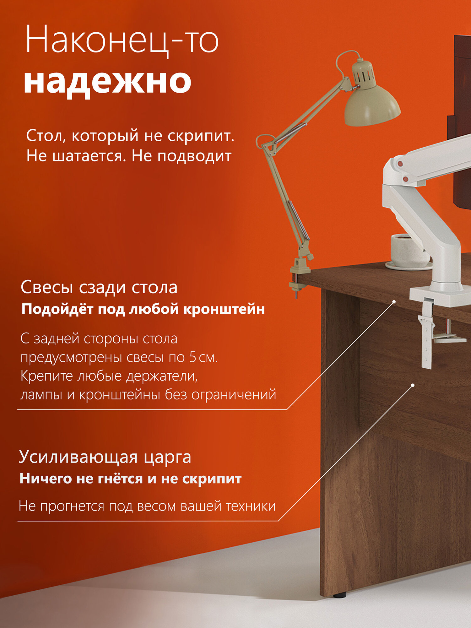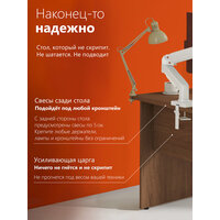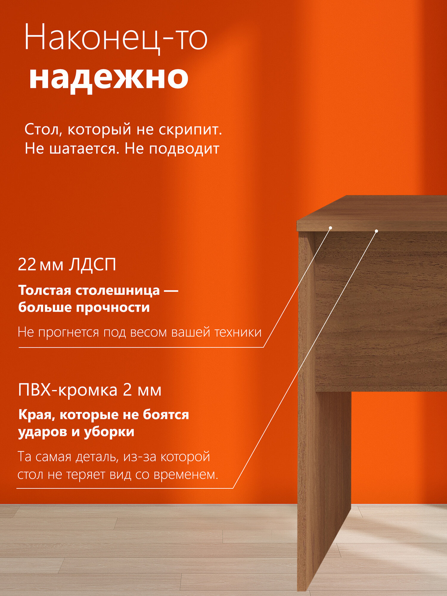 Рабочий стол оснащен солидной столешницей 22 мм и прочными опорами 18 мм из ЛДСП. Противоударная кромка ПВХ толщиной 2 мм защищает торцы письменного стола от повреждений. А регулируемые по высоте опоры обеспечат устойчивость на неровном полу.