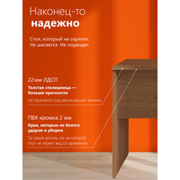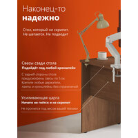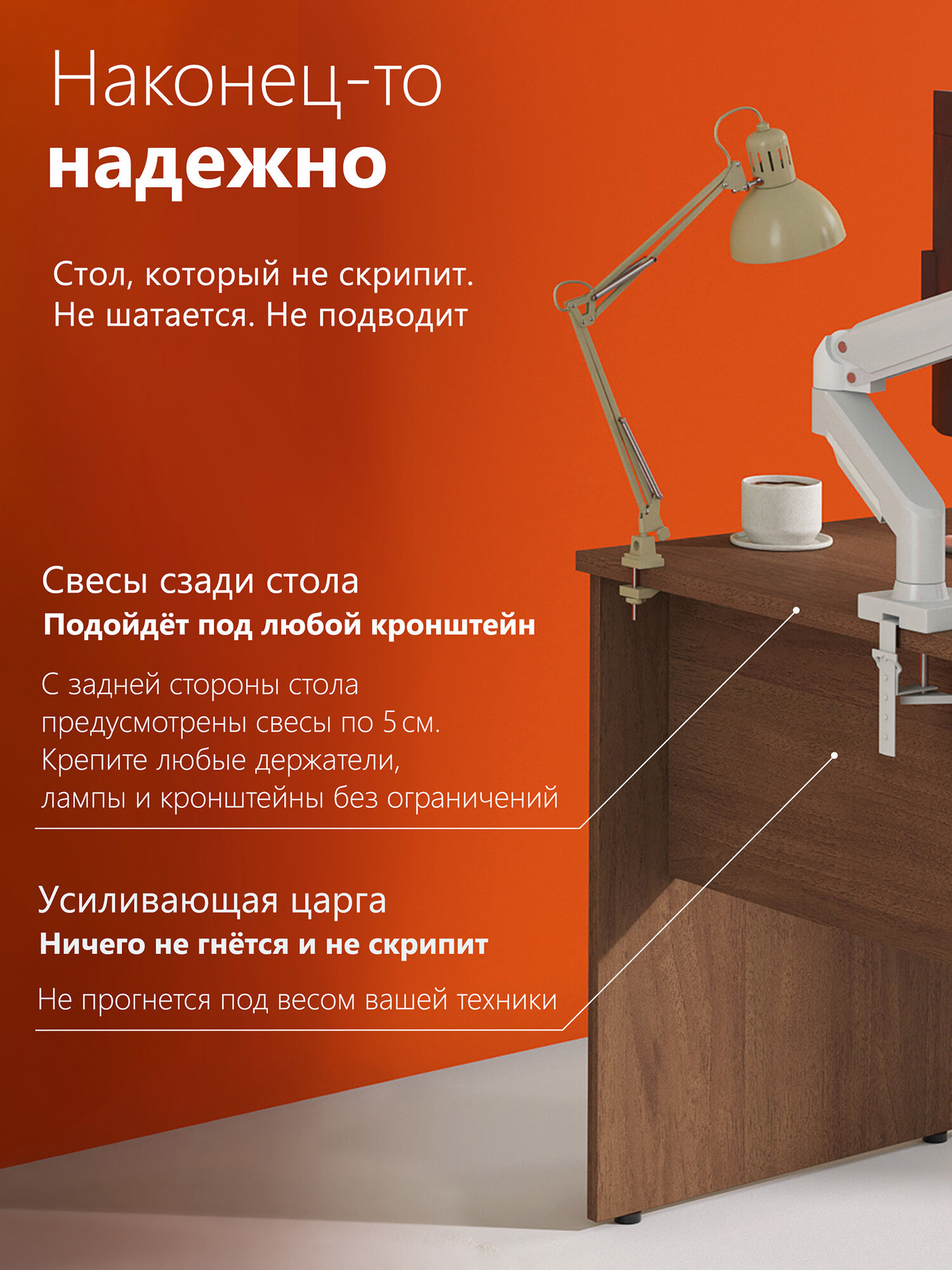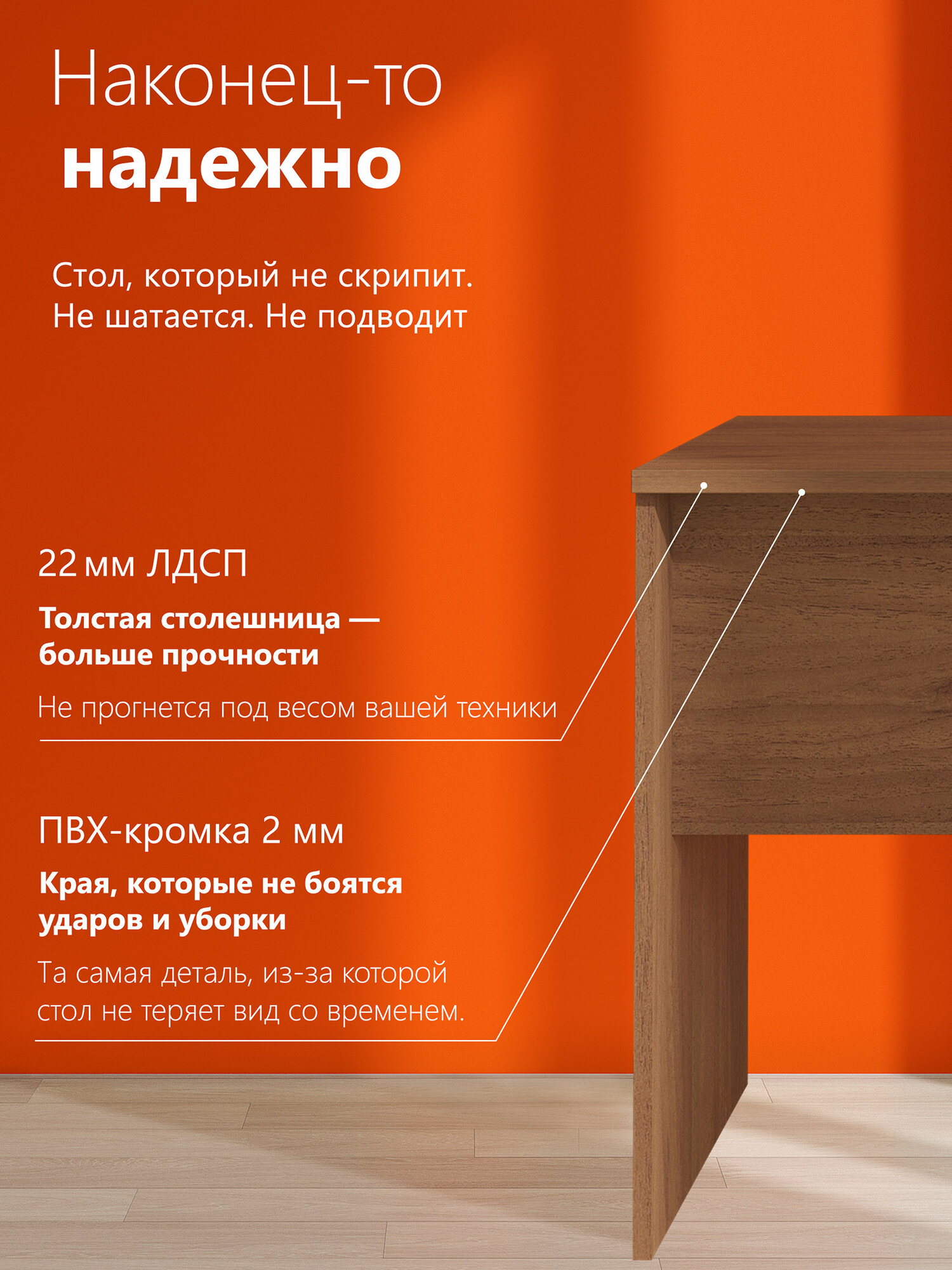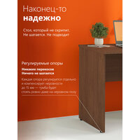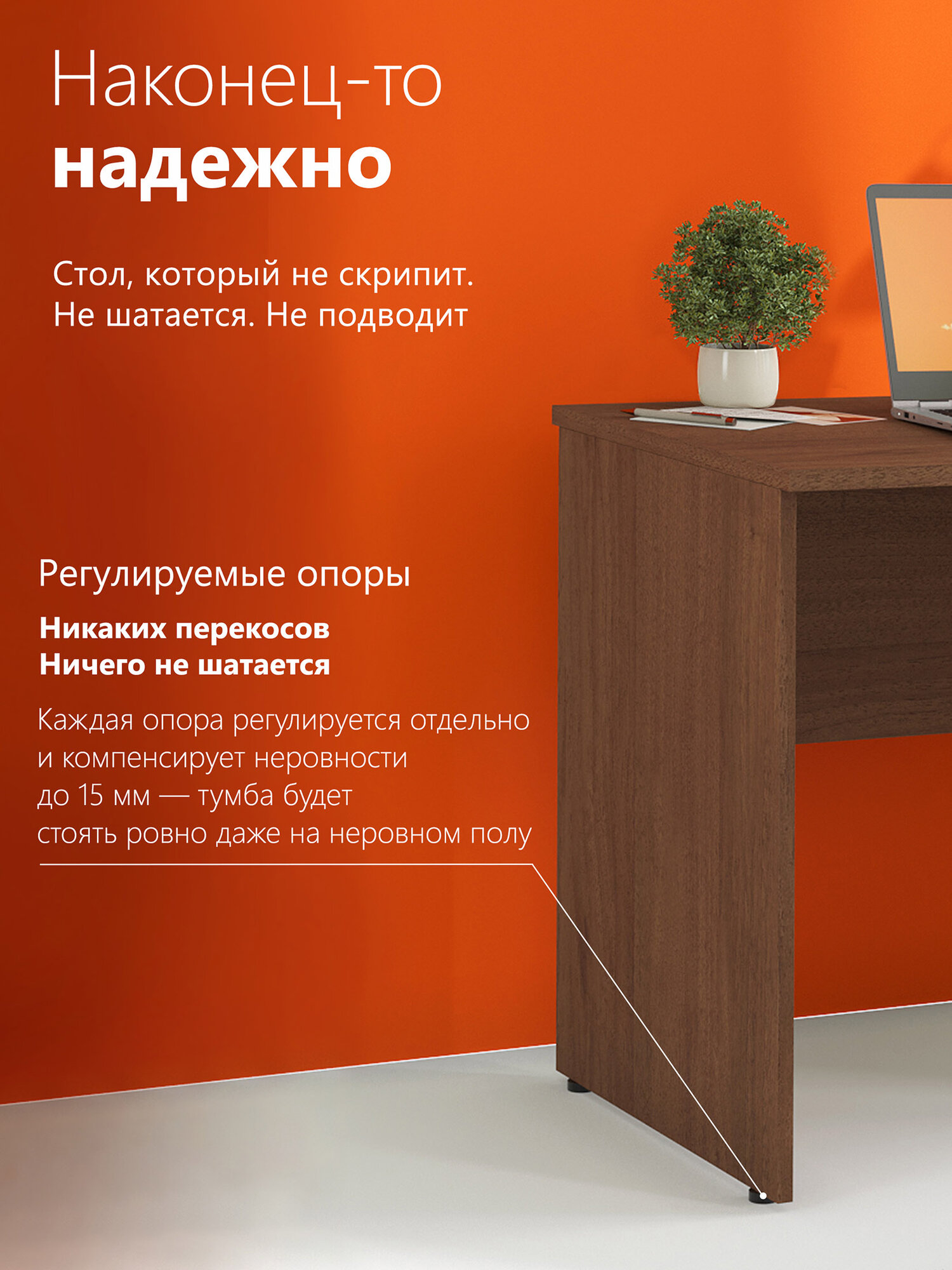 Компьютерный стол оснащен солидной столешницей 22 мм и прочными опорами 18 мм из ЛДСП. Противоударная кромка ПВХ толщиной 2 мм защищает торцы письменного стола от повреждений. А регулируемые по высоте опоры обеспечат офисному столу устойчивость на неровном полу.