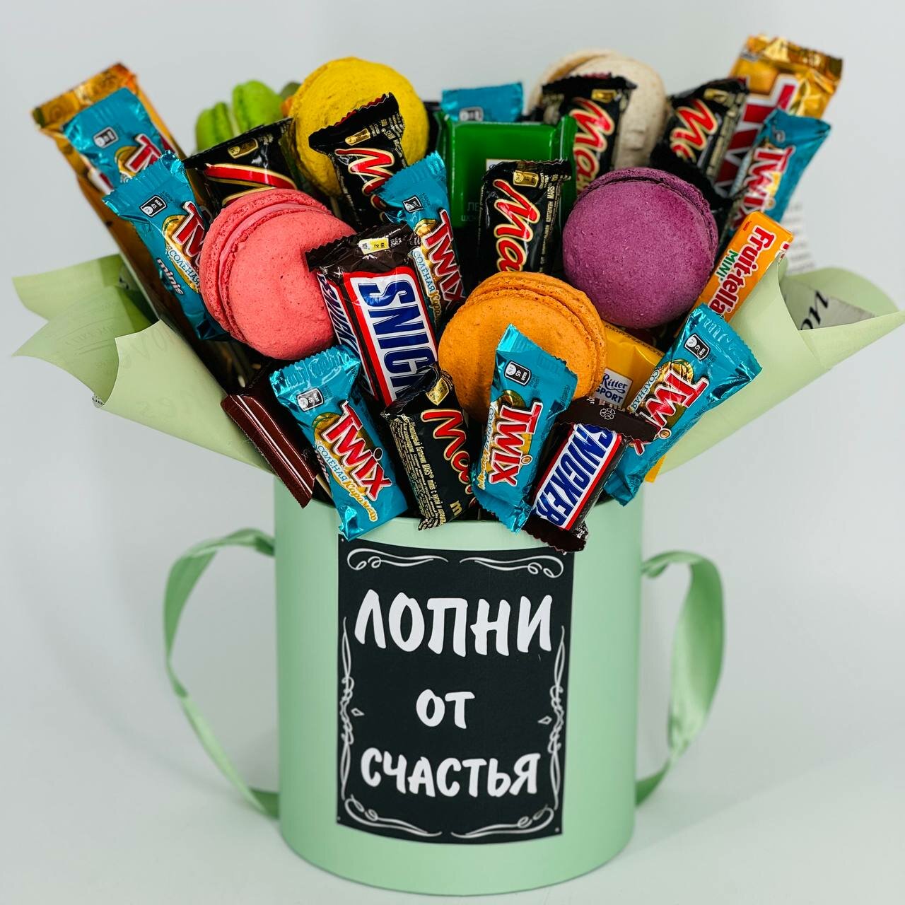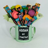 Купить Сладкий букет из макарони и шоколадок «Лопни от счастья» с доставкой по всей России. Сладкий букет из макарони и шоколадок «Лопни от счастья»: сравнение цен, характеристики, фото, актуальное наличие и цены.