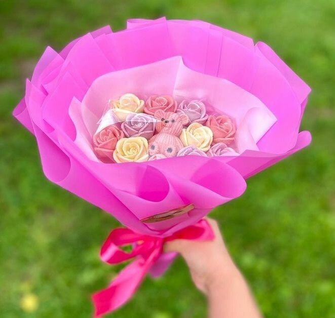 Букет упакован в подарочную упаковку розового цвета, что делает его еще более привлекательным и праздничным.