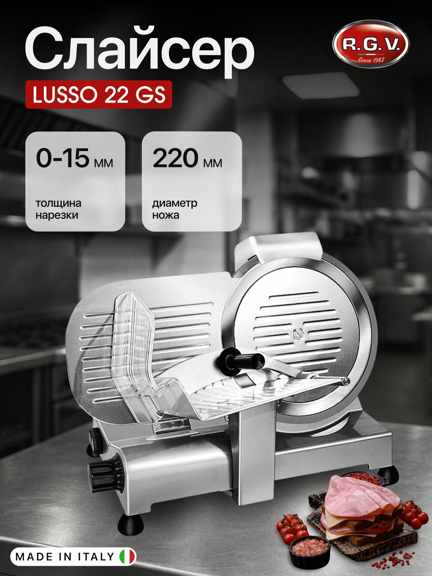 Купить Слайсер электрический R.G.V. LUSSO 22 GS, 140 Вт, профессиональная ломтерезка для колбасы, сыра и хлеба с доставкой по всей России.