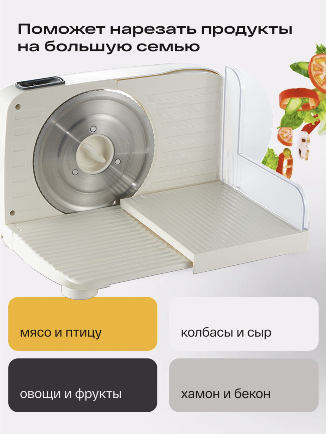 Купить Слайсер электрический с регулировкой толщины нарезки для сыра, колбасы и овощей, мощный и удобный в использовании с доставкой по всей России.