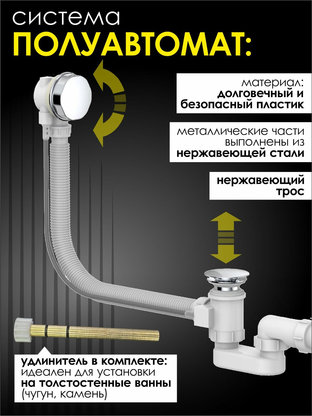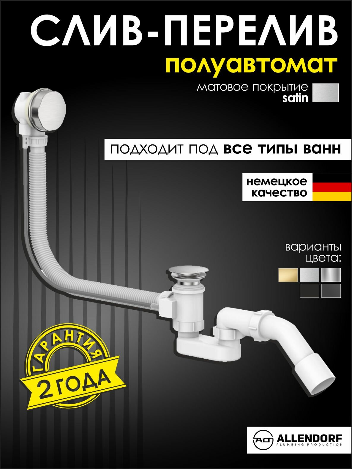 Купить Слив перелив для ванны полуавтомат ALLENDORF, сифон для слива ванной 52 мм, длина 600 мм, сатин матовый с доставкой по всей России.