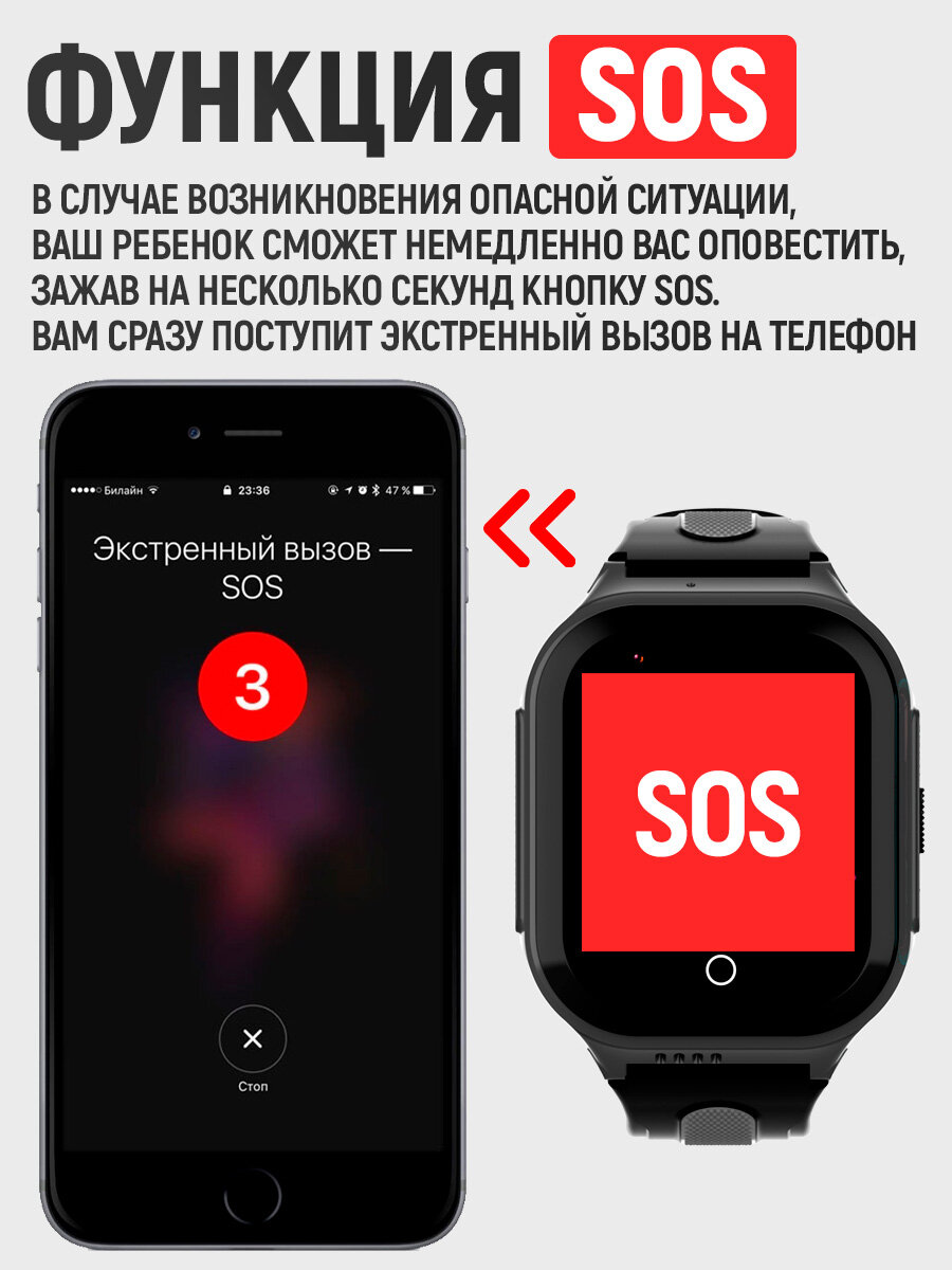- Функция SOS: удержанием кнопки можно мгновенно позвонить родителям.